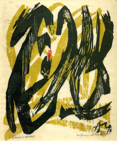 Editor: Here we have Andre Masson’s "Illustration for 'Mines de rien' by Robert Desnos," created in 1960 using mixed media, a drawing, and graphic art. The composition strikes me as chaotic, yet balanced by the color palette. What are your thoughts on it? Curator: Indeed. From a formalist perspective, it's crucial to observe the interplay between the graphic elements. Notice how the stark black background serves as a void, emphasizing the calligraphic lines of the illustration. What do you make of the contrast between the jagged edges of the white forms and the cursive script contained within? Editor: I see the contrast! The white shapes are sharp and almost aggressive, whereas the peach and yellow lines look free-flowing, almost like a dance. The juxtaposition gives the piece a vibrant tension. Curator: Precisely. The artist juxtaposes geometric abstraction and organic patterns to explore the dualities in the visual field. What significance do you see in the way Masson allows the line to dictate the form? Editor: That's interesting, I hadn’t considered that! It seems like the lines create mini-narratives or hidden geometries within the overall piece. Is the tension also a means of expression? Curator: The tensions here manifest in both texture and implied motion. The piece presents, within the interplay of these graphic elements, a compelling discourse, a dynamism pushing beyond its physical form. This challenges the static nature of print. Editor: I’ve learned a lot! Now when I look at it, I notice all these different qualities popping out that I didn't recognize at first. Curator: Likewise, the process of analyzing artwork yields new perspectives when we are actively challenged.