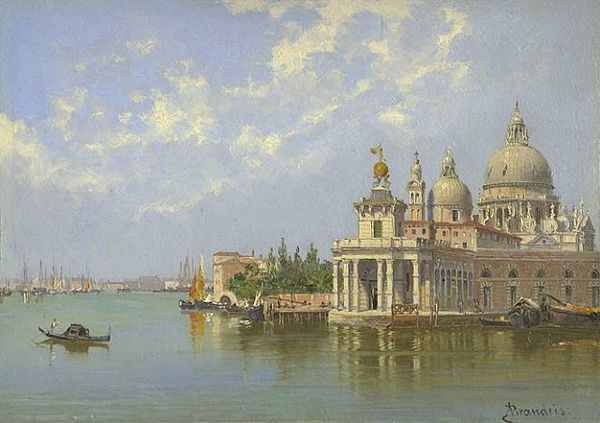Curator: This delicate rendering offers a glimpse into Konstantin Gorbatov's "Santa Maria Della Salute, Venice," realized through watercolor on paper. Editor: It has an airy, ephemeral quality, doesn't it? The colors feel almost dreamlike, pale blues and oranges meeting on the surface of the water. Curator: The watercolor technique, thin washes layering upon each other, mimics the city's own reflection. One can almost see the sediment suspended in the water that inspired those muddy colors. We might see how this captures the spirit of Venetian painting in an impressionist manner. The watercolor adds to the dreamlike effect. Editor: Yes, I notice the repetition of the dome shape and its reflection. Is that a deliberate effort to establish symbolic unity between the physical and the spiritual realms? The domed basilica is such an assertive feature that emphasizes its sanctity to the local people. Curator: Perhaps. Considering the religious function, we can be reminded that the Basilica di Santa Maria della Salute translates to Saint Mary of Health and was a visual symbol of the city’s supplication for deliverance from plague in the 17th century. Editor: Notice too, how Gorbatov positions boats in the foreground as common labors whose work in transportation gave the city commerce and meaning, against the reflection of a religious symbol that is very ethereal? There are different types of sailing in this piece as well. Curator: True. His treatment of light, the diffuse, all-encompassing quality of it, and the swift rendering of water texture is indicative of impressionist work, of capturing a fleeting moment. Editor: And through the layering of those transparent colors, Gorbatov captures not just the light, but also, for me, this deeper cultural and spiritual resonance Venice held for so many throughout history. Curator: This exploration brings Gorbatov's skill into full focus. His work highlights a moment in history as a product of technique and artistry. Editor: Exactly, the Basilica as a physical and symbolic landmark makes the artwork not just beautiful but meaningful too.