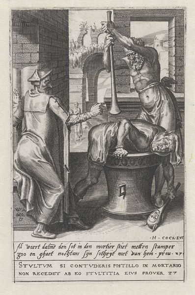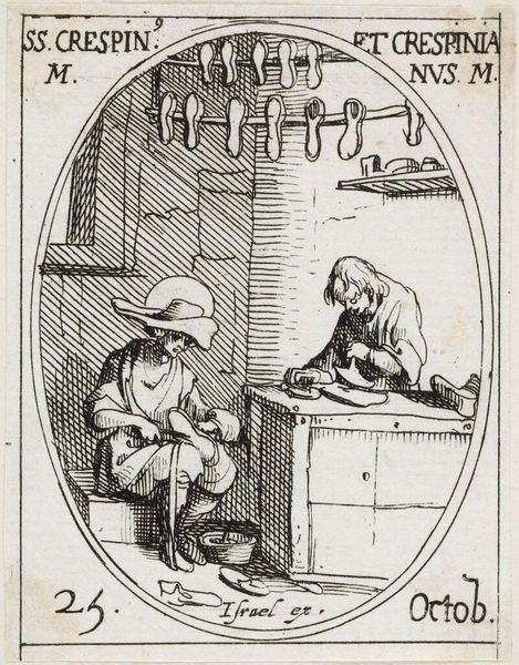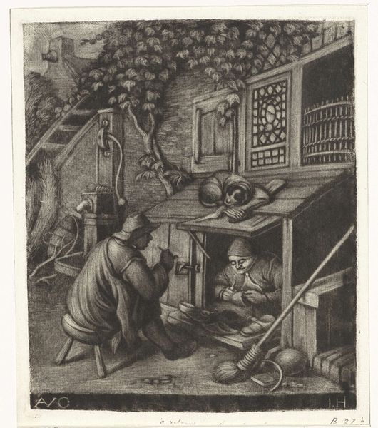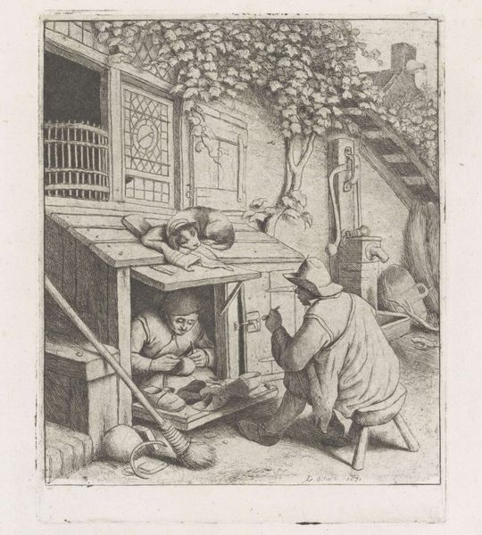 Curator: Let's take a look at "Man Lighting a Pipe in an Interior," an etching attributed to Adriaen van Ostade, possibly created between 1671 and 1900. Editor: It’s stark. The lines are so detailed and concentrated that the entire composition seems to exist in this closed-off, almost claustrophobic space. I immediately consider the social realities inherent to interiority as theme and as matter. Curator: Absolutely. And look how the interior operates on multiple levels. The space they occupy is quite literally crafted. Think about the labor involved in the simple domestic elements: The creation of the pipe, the fabrication of those wooden planks, the jug… These materials are of their time, as much of their time as any symbol. Editor: Agreed. And beyond those objects we could delve into how smoking was racialized and gendered throughout the 17th Century. Tobacco played a large role in early colonial trade networks that trafficked enslaved peoples, thus enabling Europe’s ascent to the dominant economic power. Ostade’s print shows how a global industry manifests on the domestic scale of a man’s interior. Curator: Precisely, but also what do these men actually *do* within that constructed interior? One prepares the tobacco and the other prepares to smoke it. Consider that throughout much of Western art history depictions of "lower-class" individuals involved themselves in consumption, intoxication and recreation... a sharp contrast with how paintings depict the nobility at work. The image can then reinforce societal stereotypes as part of Dutch visual culture of its time. Editor: Fair. I still fixate on the materiality—on etching, on printing. Here, the tools and technologies that facilitate making the work available also render these two figures available for popular judgement, circulating and solidifying the existing views and stereotypes. Curator: It is also very easy to be too pessimistic. One cannot ignore the very humanity imbued in such an everyday domestic activity. Even if the depiction runs afoul of today's cultural values, there is a great deal of truth and sensitivity about it that resonates centuries later. Editor: Point taken. Overall, considering how Ostade portrays the intersection of domestic space, the labor involved in its construction and enjoyment, we come to see that an interior is far more than just “four walls.”