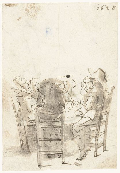 Editor: So, this is Gesina ter Borch's "Interior with Card Players and a Servant", made around 1657-1658. It's a pencil drawing on paper, currently residing at the Rijksmuseum. It has this casual, sketch-like quality to it. What stands out to you when you look at it? Curator: The piece exemplifies an emphasis on the compositional structure over realistic depiction. Note the strategic arrangement of figures around the table: the linear rhythms of their bodies, the interplay of light and shadow enhancing the spatial recession, and the contrast in textures within the depicted domestic space. Consider how the diagonal thrust of the tent form provides a structural counterpoint to the implied geometric regularity of the architecture. Editor: That’s an interesting perspective. The contrast in textures really makes certain areas pop! How would one interpret this particular play with contrast? Curator: The sketch privileges surface, not verisimilitude. The variations in texture act as markers of depth and three-dimensionality. Notice, for instance, how the sharp lines that define the architecture contrast with the softer shading defining the servant figure. We could read that contrast semiotically. Editor: So it’s less about representing reality, and more about constructing visual relationships through the use of artistic conventions. Curator: Precisely. We are dealing not with mimesis, but rather an orchestration of formal elements—line, shape, texture—to create a self-contained, visually dynamic system. Editor: Fascinating! I didn’t realize that focusing on the raw elements could lead to so much insight! Curator: Art’s essence often resides in its structural ingenuity, irrespective of subject matter or period.