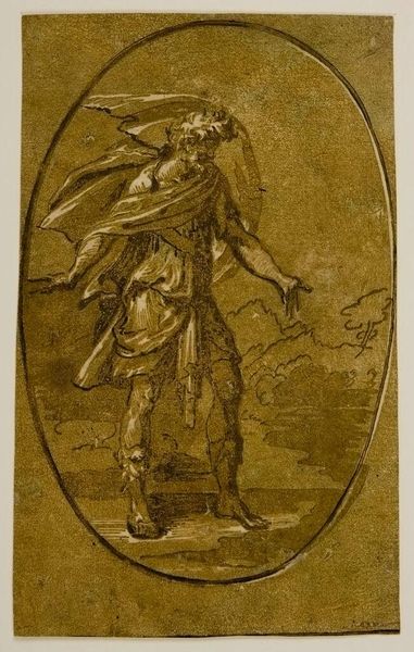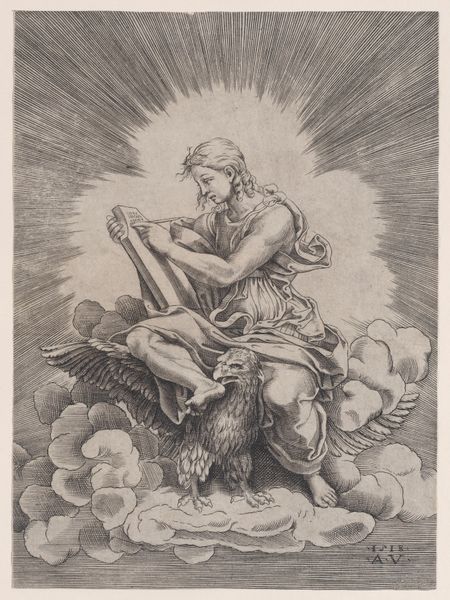 Editor: This is Agostino Veneziano's "Saint John," made with engraving. The crisp lines give it a bright, ethereal quality. What can you tell me about the methods and materiality of this piece? Curator: Notice how the engraving technique itself, a labor-intensive process of carving lines into a metal plate, mirrors the dedication and discipline associated with religious scholarship and the production of texts. Consider the consumption of printed imagery in the 16th century and the rise of printmaking workshops. How did this impact artistic production? Editor: That's fascinating. I never considered the link between process and dissemination. Curator: The material conditions surrounding the creation and distribution of this print shaped its meaning. Editor: I'll certainly keep that in mind. Thanks! Curator: It's all about the artist's labor and the materials employed.
