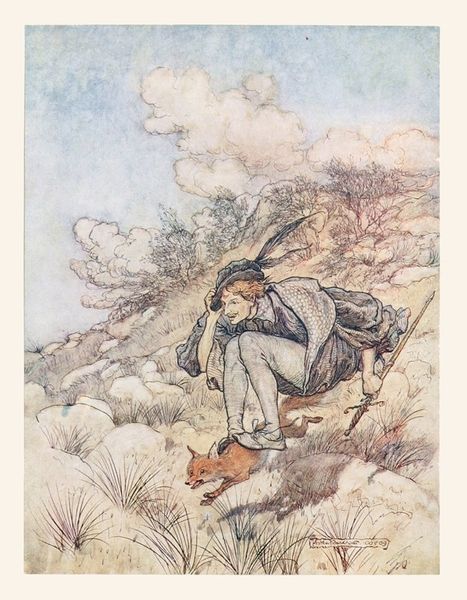 Curator: I am immediately struck by the texture of this image. There's something inherently grounding about the visual effect created by tempera on the paper; it feels quite different than looking at an oil painting of the same period. Editor: You're right to point that out! We're looking at "Prince Ivan and the Firebird," an illustration made in 1901 by Ivan Bilibin for the Russian fairy tale "The Firebird." I find the symbolism absolutely captivating. The firebird itself, a creature of light and magic, a common motif in Slavic folklore. Curator: I see echoes of Art Nouveau in the stylized borders—the recurring avian motifs. And then there's the attire of Prince Ivan— the clothing of rural laborers or peasants. How the material choices and this particular scene reflect on early 20th century Russian class dynamics is really important to point out. Editor: Absolutely! Ivan is reaching, attempting to grasp a feather from the elusive firebird. That reaching gesture itself is pregnant with symbolism. It embodies a human longing for the unattainable, for beauty, for a kind of transcendent spiritual experience. The feather becomes a symbol of that. It reminds me of pre-Christian narratives as well as emerging theosophical frameworks. Curator: Note how grounded Ivan seems, almost sinking into the earth as he leans to touch this impossible creature. Bilibin understood material reality; how clothing drapes and folds and boots crease in the grass; which helps communicate the thematic essence, if that makes sense. The constraints of the known inform the perception of magic. Editor: That tension, between the earthly and the ethereal, is truly the heart of this illustration. It’s the point at which the psychological, the cultural, and the purely visual intersect. We are compelled to imagine a meeting of worlds here. Curator: And the constraints of Bilibin's production! The work that would have been required in mixing tempera pigment and meticulously constructing each illustration to reproduce the visual sense we get from it is something to marvel at in its own right. Editor: I'll certainly be reflecting more on those unseen efforts in future viewings. Thank you! Curator: Agreed. And perhaps our audience will consider how art-making reflects and reshapes society when looking at the artworks in the rest of this gallery.