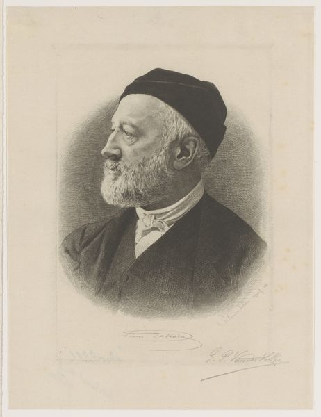 This is Auguste Danse's "Portret van Louis Gallait," an etching at the Rijksmuseum. The composition is dominated by delicate lines and subtle shading that give the work a classical feel. The choice of monochrome emphasizes form and texture over color, inviting close inspection. Danse masterfully uses hatching and cross-hatching to model Gallait's face, capturing a sense of depth and volume. The gaze is directed away, creating a contemplative mood. Semiotically, the beard and the hat symbolize wisdom and status, culturally associated with the sitter's role as an artist. The formal restraint may reflect the 19th-century conventions of portraiture, where likeness and character were paramount. Note how Danse's etching technique elevates the portrait beyond simple representation. It prompts us to think about how portraits convey social and cultural meanings through form. The emphasis on line and texture transforms the artwork into a detailed study of character and artistic method.