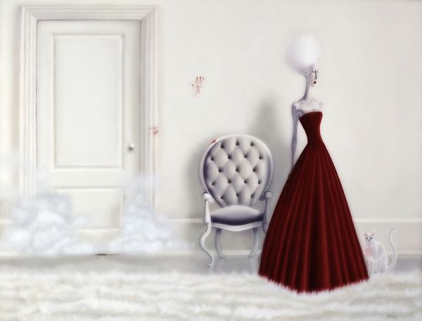 Curator: Zoe Hawk's oil painting, "Waking Eyes" created in 2022, pulls the viewer into an odd sort of dreamscape. What do you see at first glance? Editor: A silent film melodrama! Or maybe a still from an art-house horror movie? It’s undeniably unsettling, the palette all sugary and sharp. Like candy laced with something metallic. Curator: The unsettling atmosphere is very intentional, indeed. It presents an intriguing intersection of art and craft as Hawk’s labor-intensive painting utilizes oil paint, a classically esteemed material, in a style that many might categorize as "naive art." These choices create inherent tensions. Editor: Naive, but definitely knowing. Look at the almost clinical rendering of those figures – their faces are blank slates, and yet you sense so much repressed emotion churning beneath the surface. Curator: The composition reinforces that sense. The wallpaper pattern, the bed canopy – it all feels incredibly constructed. It brings up notions of set design and costuming, emphasizing artifice. I also see it hinting at the constraints placed on women, within the social roles they play, for the expectations around performance. Editor: And the dresses! That scarlet dress being offered to, or maybe rejected by, the figure in the white slip... it’s so fraught! Is it about choice, restriction, or the societal roles we are forced into? The figures occupy a dollhouse of predetermined identities. Each trapped within their own color. Curator: Exactly! And the materials, consider them as embodiments of both the promise and the restrictions within the lives of these women. Editor: I see a reflection on manufactured ideals. All the vibrant, unnatural colors suggest this isn't reality so much as a distorted memory or perhaps a constructed nightmare. It all makes one reconsider the act of “waking eyes”. To truly see beyond illusions and predetermined roles. Curator: It certainly does. This painting, with its peculiar beauty and underlying anxiety, presents a fertile ground for contemplation on production, material, labor, and their profound influence. Editor: Yes, it has definitely given my mind plenty to chew on—thank you, Zoe Hawk, for the delicious nightmare.