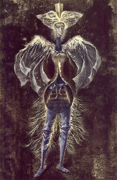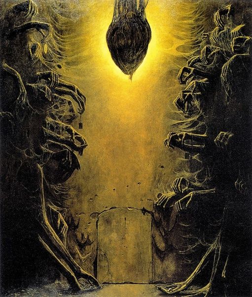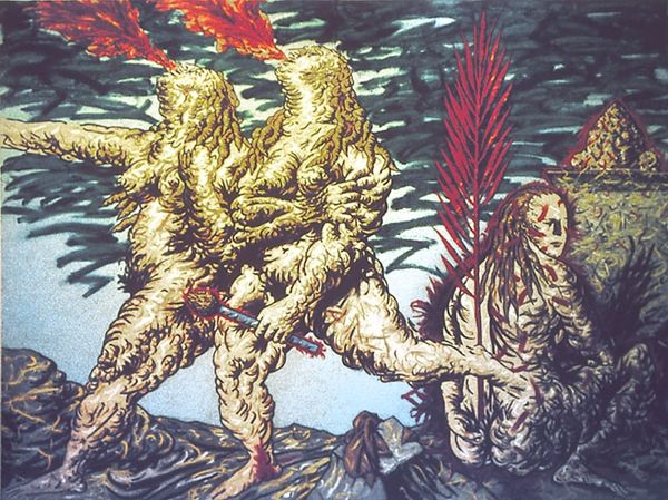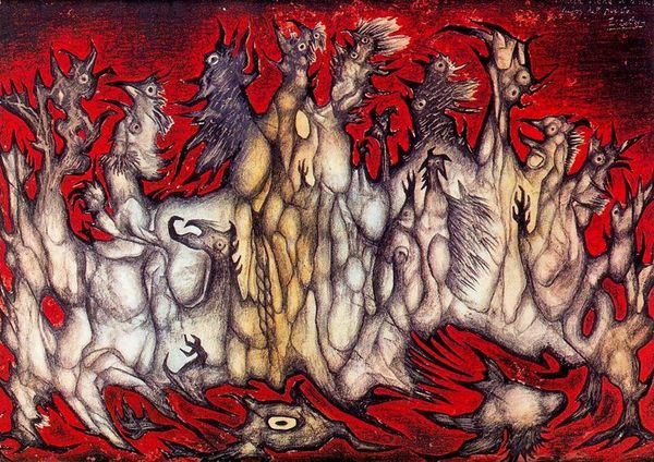 Editor: Here we have Ernst Fuchs's 1983 acrylic on canvas, "The Angel of the Lord". It’s quite imposing, with these weighty figures and a swirling, almost oppressive background. What compositional elements stand out to you? Curator: Immediately, I'm drawn to the triadic structure. Note how the figures are arranged, establishing a clear focal point in the center with the supposed angel, flanked by two supporting forms. Observe the masterful interplay of line and color that animates the composition and binds its figures to one another. Editor: The colors are very intense. They don't seem naturalistic at all, contributing to that imposing atmosphere. Curator: Precisely. The chromatic intensity amplifies the psychological tension. Fuchs seems less concerned with accurate representation, instead choosing hues to convey emotional states. The juxtaposition of red, green, and black underscores the dramatic mood. How might you decode that choice of palette through the semiotics of color? Editor: Red often means passion, even violence, maybe here indicating wrath. The green...perhaps sickness, or something unnatural? The black feels like shadows, darkness, both literal and symbolic. Curator: A valid reading. Note, too, how the impasto technique – the thick application of paint – further enlivens the surface, creating a tactile and visually arresting experience. Look at the texture within the strokes which is both chaotic and controlled. Editor: That’s a great observation! I was so focused on the colors and figures that I missed that tactile quality. This really shifts my understanding of the piece from just a representation of figures, to a deep material analysis that shows great intentionality. Curator: Indeed, by isolating these core artistic devices, the semiotic analysis of this structure empowers the appreciation of the creator's project.