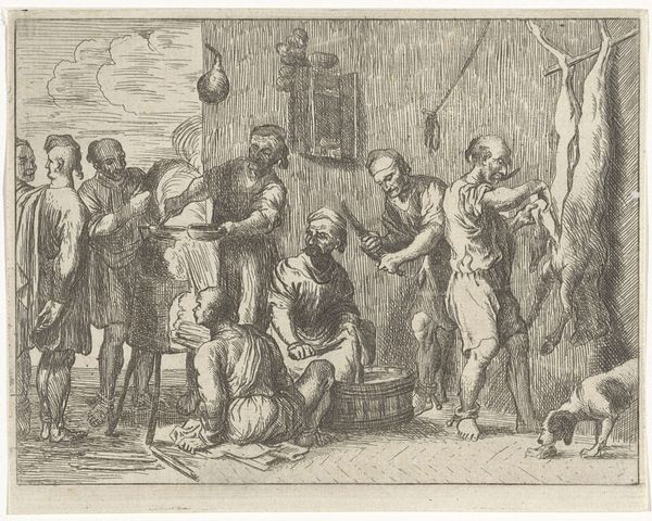 Editor: We’re looking at "Beggars before a Monastery" by Cornelis de Wael, an etching dating from sometime between 1630 and 1648. The starkness of the lines and the crowded composition create a really compelling sense of… unease, maybe? What catches your eye in this print? Curator: Well, as a materialist, I’m immediately drawn to the process of etching itself. Think about the labor involved in creating this image – the painstaking work of incising lines into a metal plate, the acid biting away at the exposed areas. It speaks volumes about the means of production during that era. How might the reproduction of images like this affect their cultural value and dissemination to the broader population? Editor: That's a great point! I hadn't really considered the implications of printmaking for accessibility. How does this process, compared to painting, shape our understanding of art's role in society back then? Curator: Precisely. And consider the social context. This print depicts beggars seeking alms. What does that say about wealth distribution and the role of the Church in providing social safety nets in 17th-century Netherlands? De Wael has an Italianate flair. Editor: It's striking how much detail he manages to achieve with simple lines. Curator: Exactly! The artist has really grappled with both materials and production, and also a difficult economic landscape for much of the European population. How the church sought to resolve those dire situations seems equally addressed by the artist here. Editor: I see that now! The material – the print – and the scene it depicts – beggars seeking help - reflect each other in a really profound way. Curator: I’m glad you made that connection! It's important to recognize that these objects aren't just beautiful; they’re products of specific historical, material conditions, and by understanding that, we can unlock deeper meaning.