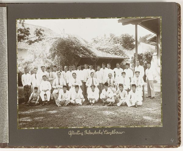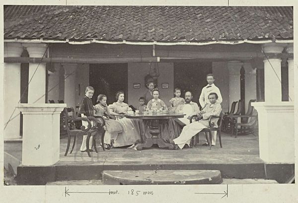 Editor: Here we have "Sociëteit" by Woodbury & Page, dating from 1863 to 1869, a gelatin silver print. It's a fascinating glimpse into the past. The men are formally dressed and seem relaxed, yet there is a underlying sense of tension. What's your interpretation of this work, considering the context in which it was created? Curator: This photograph offers a window into the social structure of colonial Java. These men, likely Dutch administrators and businessmen, represent the power dynamics inherent in the Dutch East Indies. Consider the setting – a leisurely gathering on a veranda. It speaks to privilege and control. Note the division: formally dressed men at leisure, while others stand in the background, almost as observers. Editor: So you're suggesting the photo reveals the social hierarchy? Curator: Precisely. It subtly portrays who holds authority and who is relegated to the periphery. Think about who commissioned this image, and for what purpose? Photography was becoming more accessible, so was this intended to document, celebrate, or perhaps even subtly promote the colonial lifestyle? Editor: It's interesting how seemingly casual details, like the seating arrangement or the types of clothing, become signifiers of social standing. The dog in the foreground – what does that imply, if anything? Curator: Consider how such details contributed to constructing and reinforcing a specific image of colonial society – one of order, civility, and European dominance. Even the seemingly benign presence of a pet serves to reinforce a particular idea of domesticity and control over the landscape and its people. What's your feeling about the way that light functions in the photograph? Editor: Now that you mention it, the shadows create depth, and a certain gravity that anchors the scene. The interplay of light and shadow definitely accentuates the serious nature. I see so much more to this piece now! Curator: And hopefully recognize how historical context dramatically shapes our interpretation of even a simple photograph.