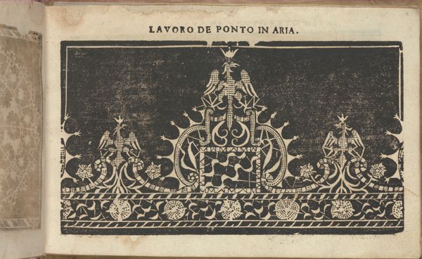 This is page four from "Studio delle virtuose Dame," a book of embroidery patterns created by Isabella Catanea Parasole around the turn of the 17th century. The stark contrast between the black background and the white of the design immediately draws the eye. The design itself is a complex, symmetrical arrangement that combines geometric and organic motifs. Look closely at the semi-circular band that dominates the composition; the artist presents us with heraldic symbols and stylized foliage. The central cartouche contains a figure in profile, possibly a portrait, framed by text, alluding to the convergence of image and language that challenges the autonomy of each. The linear exactness is striking. The patterns are not just decorative; they represent a fusion of artistic and intellectual components. This book served a practical purpose while also reflecting the cultural values and philosophical views of its time, when the art of embroidery was undergoing a profound re-evaluation. The elaborate design of the 'Studio delle virtuose Dame' is a testament to embroidery's complex symbolic and cultural importance, inviting viewers to consider the layers of meaning embedded in its structure.