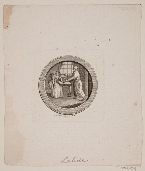 Editor: This is "Frihed. Vignet med Dame, der s\u00e6tter en fugl i frihed," or "Freedom: Vignette with a Lady Setting a Bird Free" by Gerhard Ludvig Lahde, made in 1794. It's an engraving. It feels quiet, domestic… almost like a captured moment of release. What stands out to you? Curator: The image vibrates with the potent symbolism of its time. This vignette, created during the height of revolutionary fervor in Europe, offers a complex reading of liberty. Observe how the woman, framed within this enclosed interior, releases the bird, a feathered soul, toward an open window. Editor: Yes, the open window is important. What's its significance? Curator: The window functions as a portal, a conduit to the exterior world. The bird's flight signifies not just physical freedom but a breaking of intellectual and social confines. However, it is also crucial to observe that this act occurs within the confines of a domestic sphere. This placement begs the question: who truly experiences liberation? Is freedom selectively granted? Editor: So, it's more complicated than just a simple symbol of freedom? Curator: Precisely. It is a carefully constructed image ripe with allegorical implications, especially considering the era in which it was produced. The iconography of birds often is associated with spirits and the soul. The release may signify transcendence. Editor: I hadn't considered the spiritual aspect, but it adds another layer to it! Curator: Art allows us to examine what freedom truly means by revealing symbols to the world, one line, one idea at a time. Editor: Thanks; now I appreciate the depth within what seemed to be such a simple scene!