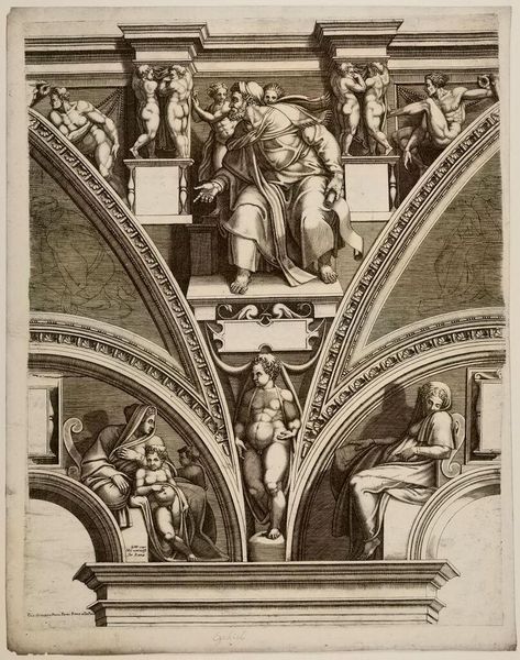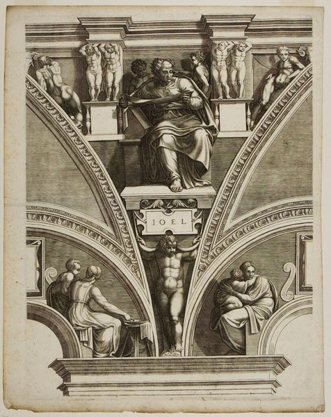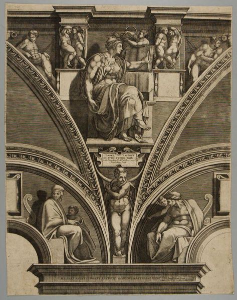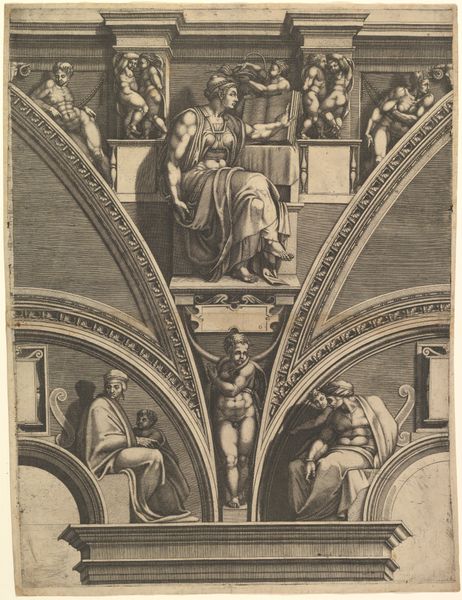 Curator: This engraving, "Sibylla Erythraea," was created by Giorgio Ghisi, an Italian printmaker who lived from 1515 to 1582. It's currently held at the Harvard Art Museums. Editor: My first impression is one of immense power; the figure dominates the space. It’s an interesting architectural presentation. Curator: Ghisi's print is based on Michelangelo's Sistine Chapel frescoes. It demonstrates the cultural and artistic influence the Vatican had at this time. Editor: Absolutely. And as an engraving, think about the labor and skill involved in translating Michelangelo's broad brushstrokes into such meticulous lines. The material process itself becomes a form of interpretation and distribution. Curator: It's also fascinating to consider the politics of imagery—how this artwork disseminated religious narratives and shaped public perception of power. Editor: Indeed, and how it transformed the role of printmaking in replicating art to the public. Curator: It’s an amazing insight into the world’s artistic and sociopolitical landscape. Editor: Yes, a powerful example of artistic labor and the dissemination of iconic imagery.