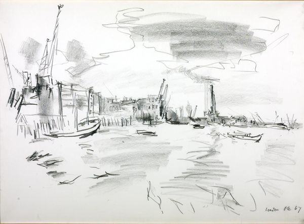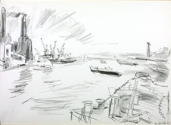 Editor: Here we have Oskar Kokoschka's "Port of London I," a drawing done with graphite. It feels like a fleeting moment captured with such delicate strokes. What can you tell me about its historical context? Curator: Kokoschka, known for his expressive style, often engaged with the sociopolitical landscape. Consider London itself: a hub of global trade and imperial power. How does Kokoschka's sketch, with its focus on industry and the river, engage with the public image of London at that time? Editor: So, it's not just a pretty picture, but a statement about London's role and image? I'm starting to see more depth. Curator: Precisely. Think about the politics of imagery – what is included, what is omitted, and how does that influence the viewer's understanding? Editor: That gives me a lot to think about. Thanks! Curator: My pleasure. Examining the role of art in shaping public perception is always rewarding.