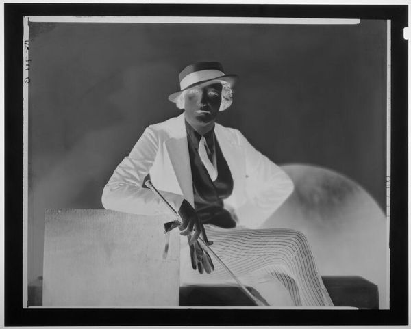 Curator: This arresting portrait is a photograph of Alphons Diepenbrock by W.G. Hondius van den Broek, created sometime between 1895 and 1925. It offers a compelling glimpse into a bygone era, rendered in stark monochrome. Editor: My first impression? Ethereal. Like a ghost captured in time. The high contrast gives him this almost luminous quality, and the overall effect is one of delicate, haunting presence. It reminds me a bit of some very early spirit photography... Do you think there might be something similar in this? Curator: The effect might be due to the photographic process itself. Negative images like these have their own stark beauty. Look how sharply the features are defined, while still maintaining softness. But spirit photography as a link… interesting. Considering that the portrait was made in the period when beliefs around spiritism and paranormal phenomena were very strong and vivid. The inverted contrast does give it an uncanny air. I wonder how contemporaries might have viewed this inversion. Editor: And look at the way he is posed: his hand is slightly tucked into his vest and the other dangling loosely as though time has suddenly caught him in the act of moving, not posing. Does the hand in vest suggest a particular persona, almost like a performance or an idealization of Diepenbrock. Curator: Yes, that gesture was indeed a fairly conventional pose in 19th-century portraiture—signifying composure and status but within a context where status was not always openly stated, but signaled and recognized. Yet, within the rather rigid rules that define that period for photography, there's still a sense of a personality trying to be revealed. Editor: Absolutely. The image hints at his inner self, this musician. Do you get that, or am I totally projecting now? Maybe I am seeing what I know about his body of work... Curator: Not at all. Portraits often serve as mirrors reflecting not only the subject, but also the viewer. The slight unease created by the reversed tonality coupled with the standard codes and postures evokes the image of what a modern composer, surrounded with classical codes, looks like to the world: familiar but strange at the same time. Editor: A compelling figure indeed. Curator: Definitely one to think about a while longer. Thanks for sharing your vision on it.
