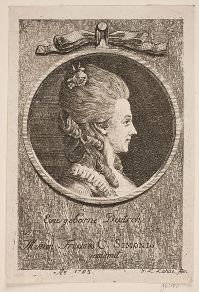 Editor: So here we have, "Portret van Philippine Engelhard," an engraving by Gotthelf Wilhelm Weise, sometime between 1780 and 1810. I'm really struck by how delicate it feels, almost ephemeral, like a whisper from another century. What leaps out at you when you look at this, beyond the obvious? Curator: Ah, yes, a whisper indeed! For me, it’s the gaze that grabs me – doesn’t it feel like she's sharing a secret, maybe something just a tiny bit scandalous? But beyond that, the artist's technique speaks volumes. The baroque influence is hard to ignore here. See how the swirling lines in her hair contrast with the stark oval border surrounding the subject's image? It’s a theatrical presentation, framing her like a prized jewel. Don’t you think so? Editor: I do, now that you mention it! And that almost playful use of line, considering it’s an engraving, gives it a lightness I wouldn’t expect. I guess I’m used to thinking of engravings as being quite formal. Curator: Formal, yes, but Weise also adds a wink and a nudge to history. He wasn’t just documenting; he was interpreting. It reminds me of a mischievous playwright staging a historical drama – respecting the period but adding his own clever touches. Look at the almost absurd height of her coiffure; you can't take that too seriously, can you? It is humor in history. Editor: No, you’re absolutely right! I love that. It makes me want to know everything about Philippine Engelhard herself – who was she, what was her story? Curator: Exactly! Art isn't just about what’s on the surface, it's also about what it makes us curious about. And sometimes, it's okay to giggle at history, too. Editor: Absolutely. I never thought about approaching historical pieces that way, so thank you. This was really fascinating.