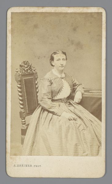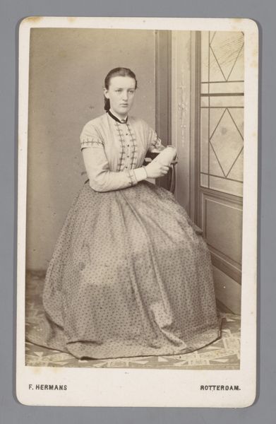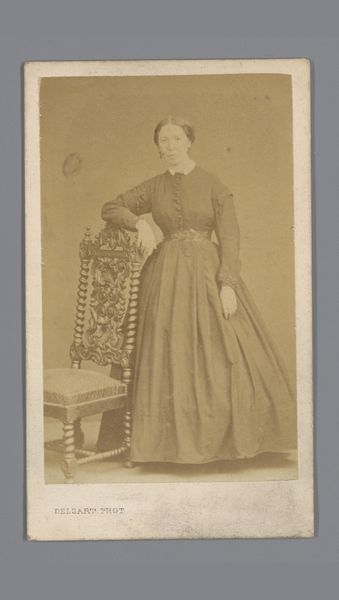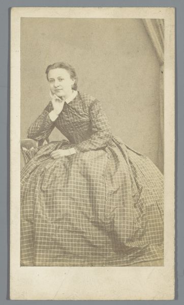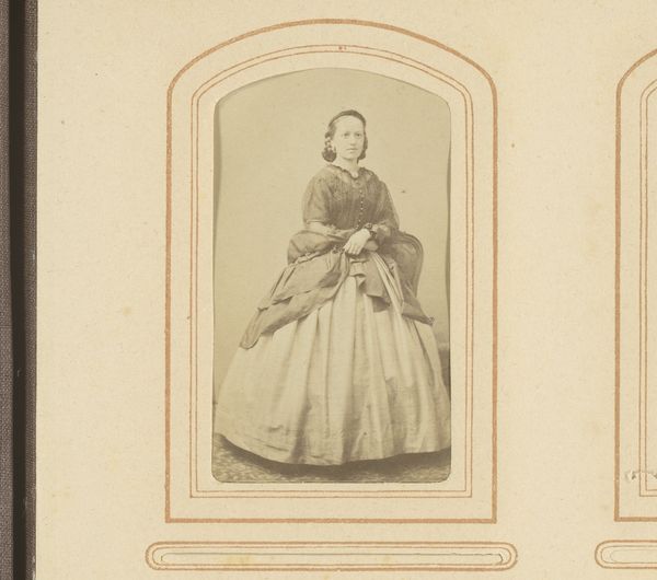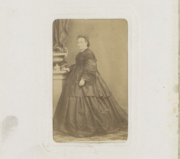 This is a photograph of an unknown woman by Standaert Frères, likely made sometime in the mid-19th century, judging by the style of dress. The image offers a glimpse into the social codes and power dynamics of the time. It was a period when photography was becoming more accessible, yet portraiture remained a privilege, largely reserved for the middle and upper classes. This woman’s attire, particularly the elaborate dress and possible headpiece, signals a certain social standing. The carefully composed pose, the placement of her hands, and the presence of decorative elements like the table and hat, all contribute to a constructed image of respectability and status. Historical archives, fashion studies, and photographic studio records could reveal more about the sitter and the studio's clientele. Ultimately, this photograph serves as a reminder that our understanding of art is inseparable from its social and institutional context.