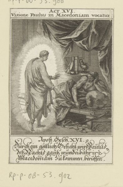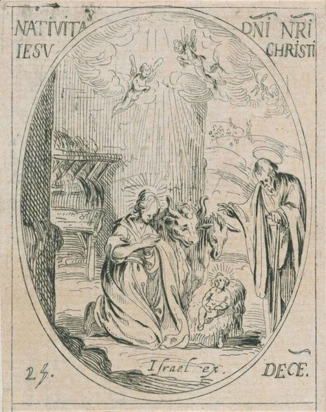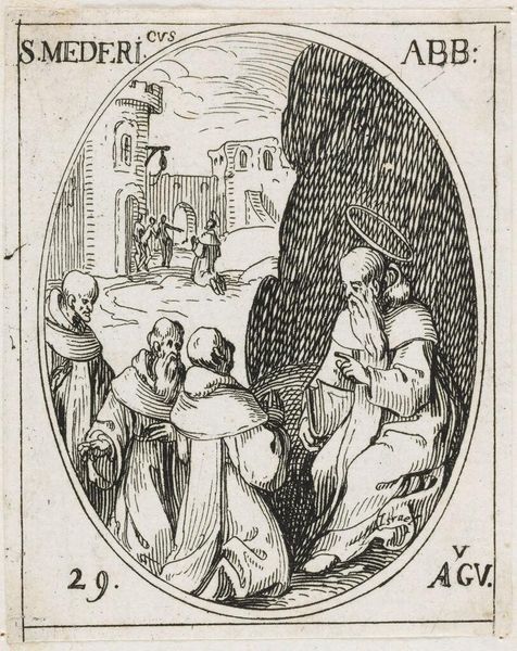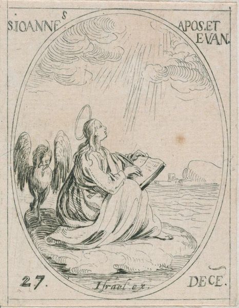 Editor: We’re looking at Jacques Callot’s "Virgin in Anticipation of the Birth of Christ," a tiny print. The hatching is incredible. What do you see in its composition? Curator: Observe how Callot uses the oval frame not just as a border, but as a dynamic element. The Virgin’s upward gaze and the implied light source create vectors leading our eye upwards, while the architectural lines ground the scene. Editor: So, it's about more than just the subject; it’s how he uses lines to direct our gaze? Curator: Precisely. Consider, too, the contrast between the controlled lines forming the figures and the looser, almost chaotic rendering of the clouds. What does that contrast suggest to you? Editor: I hadn't noticed that before. The tension between the forms really brings it alive. Curator: Indeed, and that is where the genius lies.