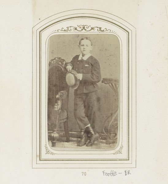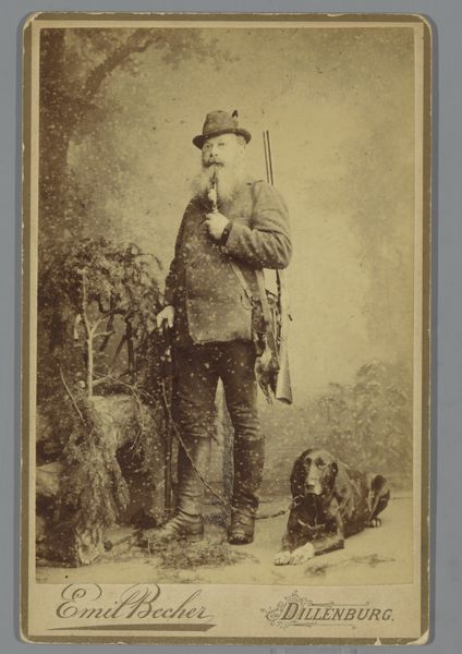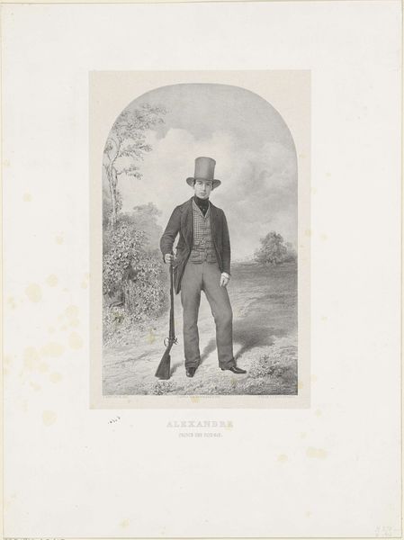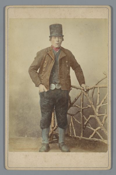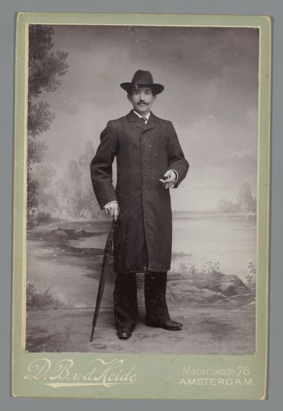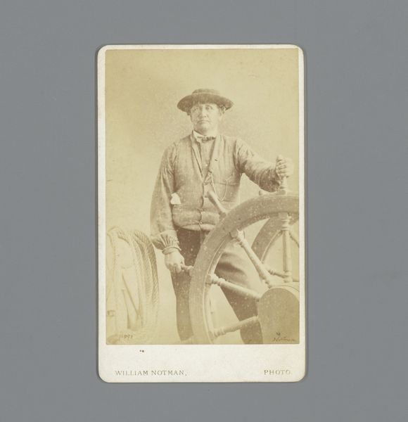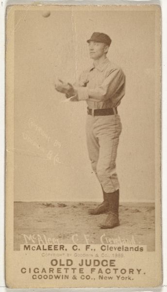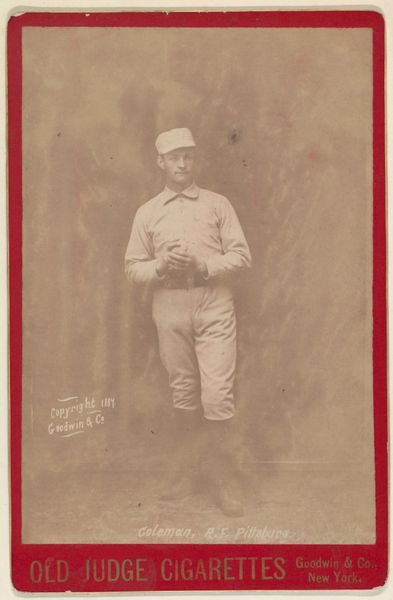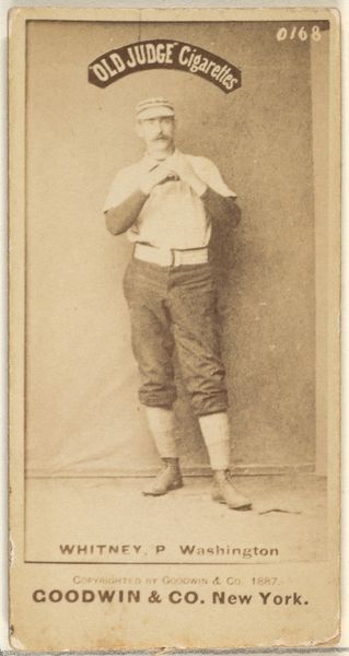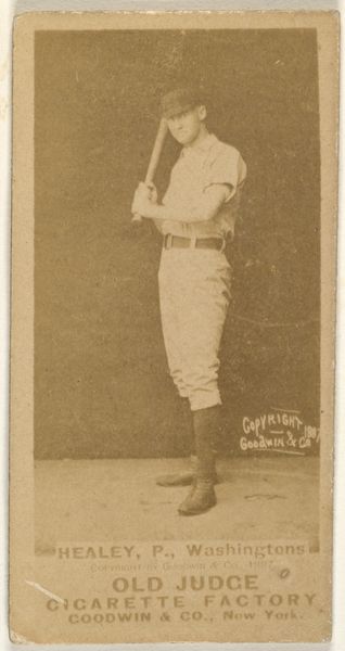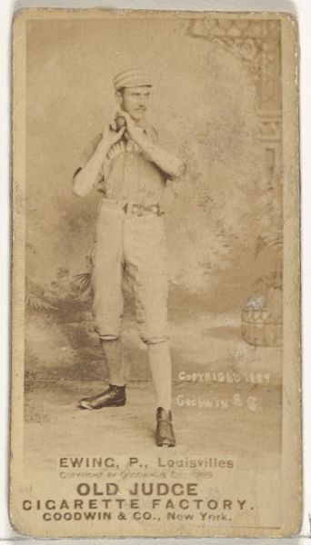 Editor: This is "Dunbine, from The World's Racers series," printed in 1888 by Allen & Ginter. It's a small print, almost like a trading card. The most striking thing is the rich color of the horse – what can you tell me about this piece? Curator: The work compels us to consider its formal qualities first. The horse's deep reddish-brown coat dominates, punctuated by the jockey's cooler blues and yellows. Note how the artist has carefully modulated the texture, implying musculature and sheen. Editor: It feels almost stylized, not entirely realistic. Curator: Precisely. The almost caricatured rendering of the landscape serves primarily as a backdrop, framing the dynamism of the horse and rider. Consider the composition: the diagonal of the horse’s body cuts assertively across the rectangular format. Do you find the artist's choices in rendering and composition effective? Editor: Yes, definitely! The diagonal line gives it a sense of motion, and the limited color palette keeps the focus tight. I initially overlooked how deliberate the placement of text and the landscape really is. Curator: Indeed. We can analyze the piece through its compositional structure, independent of subject or external factors, allowing a close consideration of its form, lines, and its colour palette. Editor: Thinking about just the lines and colors has really opened my eyes to the care taken in designing this card! Curator: A deep, and hopefully memorable, observation to appreciate moving forward.