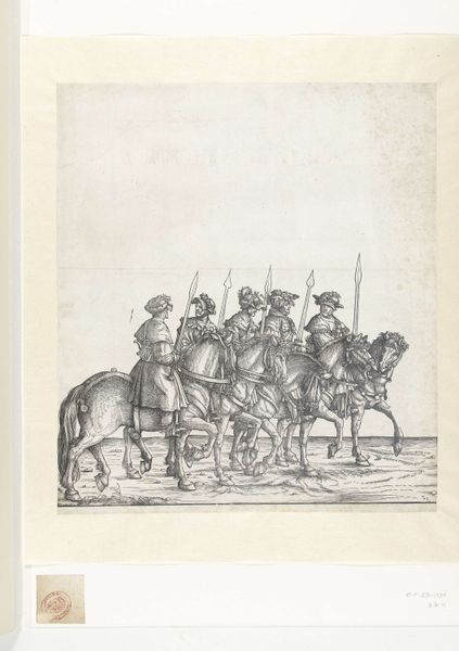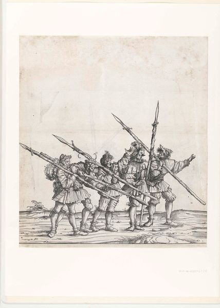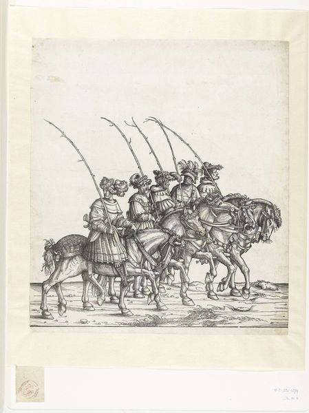 Curator: Here we have “Ruiters en voetknechten,” or “Horsemen and Foot Soldiers,” a woodcut and engraving crafted in 1537 by the Northern Renaissance artist, Hans Schäufelein. Editor: What immediately strikes me is the intensity of detail, a symphony of textures created by intricate lines. It almost feels sculptural despite being a two-dimensional print. Curator: Indeed, Schäufelein was operating in a period of significant shifts in the representation of power. This work, likely commissioned, showcases a regimented military display. Notice the symbolic adornments, the emblems of power woven into their garments and weaponry. This wasn't just about documenting; it was about projecting authority and order during a time of considerable social upheaval with the Reformation brewing. Editor: The composition itself reinforces that sense of order. The figures are stacked, yet distinct, their gazes carefully arranged. I’m particularly drawn to the tonal range achieved with such a limited palette—the deep blacks offering a dramatic contrast against the stark white of the paper, creating a real dynamism. Curator: The choice of woodcut and engraving is interesting too, offering both accessibility, allowing for reproduction and widespread distribution, and allowing an impressive level of fine detail, which we see clearly in their attire and equipment. This also reflects on a more general trend to spread ideals during the religious reformation in Germany and to spread more personal art to people of different classes. Editor: Look at the almost playful treatment of light! The subtle gradations lend volume and weight to these figures. See, for instance, the texture and implied shape in the rounded caps and hats. I find these small touches to be remarkable. Curator: It speaks volumes about the patronage system of the time, doesn’t it? Commissioned art became a method for political positioning and legacy making. Schäufelein had clearly mastered capturing the nuanced needs of his patrons. Editor: Ultimately, I’m left impressed by Schäufelein's mastery. The line work, the composition... everything feels incredibly deliberate and effective. Curator: And for me, the print serves as a fascinating snapshot of its historical moment, reflecting both artistic skill and political aspirations.
