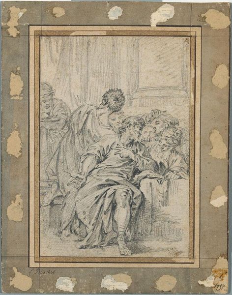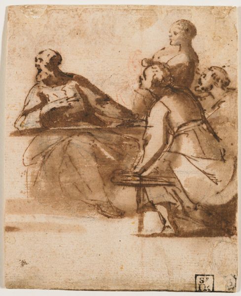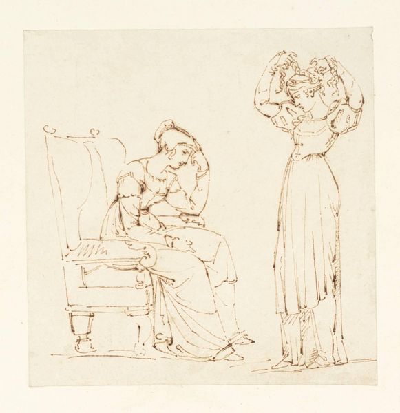 Herman Frederik Carel ten Kate made this small drawing, entitled 'Older Couple in Conversation', using pen in the Netherlands sometime in the 19th century. The sketch gives us a glimpse into the domestic life of a middle-class couple. The woman sits passively at a table with a cup, while the man gestures animatedly. Is he explaining something, or perhaps even lecturing her? The drawing speaks to the conventional gender roles prevalent in 19th-century Dutch society. The woman is confined to the domestic sphere while the man is active and engaged with the outside world. To understand this work better, we could look at etiquette manuals and conduct books from the period, which offer insights into the expected behaviors of men and women. Examining household inventories and probate records might reveal details about the material circumstances of middle-class families like this one. This drawing encourages us to consider the social codes and power dynamics that shaped people’s lives in the past.