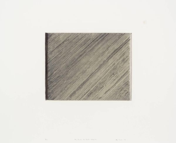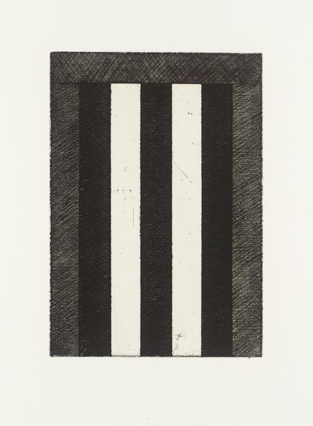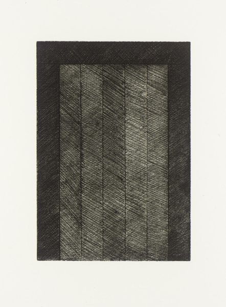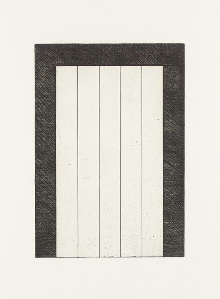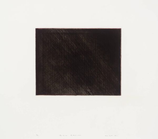 Editor: This untitled etching by Brice Marden features a textured black rectangle framed by white borders. It feels very architectural to me. What historical influences might have shaped Marden's minimalist approach? Curator: Well, think about the late 20th century. Institutions were grappling with representation after movements like Pop Art challenged the established art world. How does this etching, with its stark simplicity, position itself within that dialogue? Editor: I guess it's a reaction against the chaos and commercialism, maybe a return to basics? But is it just about aesthetics, or is there a social commentary here? Curator: Minimalist art often invites viewers to find their own meaning, but remember, the context of its creation is crucial. How might galleries and collectors have influenced Marden’s artistic choices and the reception of his work? Editor: So, the art world itself becomes part of the artwork's meaning? That's a really interesting point! Curator: Precisely. By understanding the cultural landscape, we can better appreciate the complex layers within even the simplest forms.