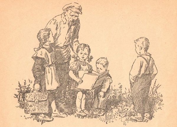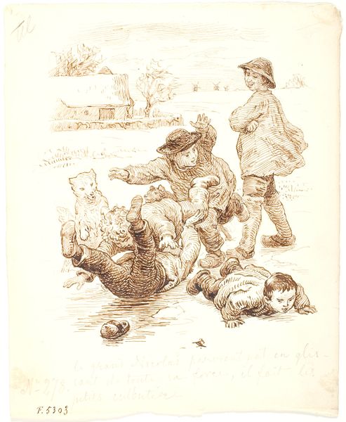 Editor: Here we have Hryhorii Havrylenko’s Illustrations for Mikhail Stelmakh's book "In the Hedgehog's Windmill," created in 1956, using ink on paper. It shows children walking. The simplicity of the drawing gives it a sense of childlike innocence. What's your take on it? Curator: Considering its creation during the Soviet era, I look at the very materiality and production surrounding it. Paper, ink – these were often subject to state control. Who had access, and to what quality of materials? Even the act of drawing, of illustrating a children's book, was a form of labor within a system. The very *making* of art during this period can tell us a great deal about social structures. Editor: So you’re thinking about the conditions that allowed this work to come into existence, not just the image itself? Curator: Precisely! How did the artist navigate the limitations imposed? Ink wasn’t just ink; it was a product, distributed through certain channels, imbued with political weight. Think about the labor involved—did Havrylenko have access to a studio? Were they commissioned? These material conditions are as important as the aesthetic result. Editor: That's fascinating. It shifts my focus from simply viewing it to considering the entire system it existed within. I wonder if the line work itself reflects any of those constraints... was a quick line more efficient to get the art approved more easily? Curator: That is a question worth pursuing! How much time and resource was he willing, or allowed, to commit to the materials? Was "Realism" a state directive, which meant focusing on simple forms that aligned with Socialist messaging? How did these elements dictate not only the subject, but the form and material too? Editor: I never would have considered looking at this through the lens of state-controlled resources. It makes me think about what freedoms and restrictions were at play behind the scenes. Curator: Exactly. The "folk-art" and genre aspects are intertwined with the means of production, the materials available, and even the state's agenda to make folk art more visible.