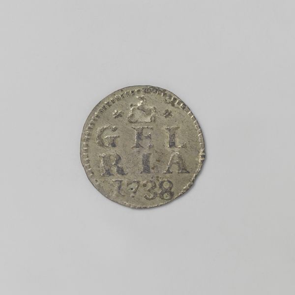Curator: Here we have a fascinating little artifact: a silver "afslag" – essentially a trial strike – of a Gelderse halve duit, dating back to 1756. Gelderland, of course, refers to the province within the Netherlands. Editor: Tiny but mighty! It's got this quiet intensity, like a forgotten spell someone once cast over their grocery money. And that silver... it has a weight of history about it, doesn't it? Curator: Indeed. Examining its production in the context of the Dutch Golden Age, we have to acknowledge the socio-economic hierarchies it represents. Coinage like this signifies not only economic power but also the control and dissemination of visual language supporting the ruling classes. Consider the impact of repeatedly seeing these symbols and names – "Gelria," the Latin name for Gelderland, reinforced through daily exchange. Editor: Oh, absolutely. But stepping away from the discourse for a sec, those little flowerettes dotting the top and bottom… they’re so darn sweet against the serious pronouncements etched into the surface. Almost a subtle act of rebellion from the engraver, perhaps? A wink in the face of authority? Curator: That's a compelling interpretation. The juxtaposition of delicate floral motifs alongside the bold pronouncements of the region does create a tension. While purely speculative, we could read this as an assertion of the region's natural beauty, almost a claim against purely monetary worth – perhaps alluding to inherent values beyond mercantilism. Editor: Right? Or just because pretty flowers are cool, and make even tiny coins less dreary! Speaking of which, what is that underneath "1756"? Is that some sort of bird or insect? Curator: You have a keen eye. That would be a small depiction of an eagle, used here as a heraldic emblem, symbolising power and vigilance. Its placement here reaffirms the authority that this coin carries as legal tender. Editor: Such serious symbolism on something that probably bought you, like, a loaf of stale bread back then. It's charmingly absurd when you think about it! Almost Kafkaesque. Curator: I see your point, but I would like to propose an interpretation, using the context of Dutch mercantilism and colonial exploits during the 1700s, focusing our understanding on… Editor: Woah there! Maybe, sometimes, it’s just a pretty little piece of shiny metal with some flowers and a grumpy eagle. Sometimes the poetry is enough, you know? Curator: Well, regardless, it highlights the convergence of art, politics, and daily life in the 18th century. It certainly encourages a deeper exploration into both official histories and subjective readings of value. Editor: Agreed! I think I might just carry it around for a bit. Get in touch with my inner 18th-century capitalist.
