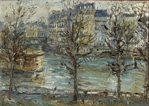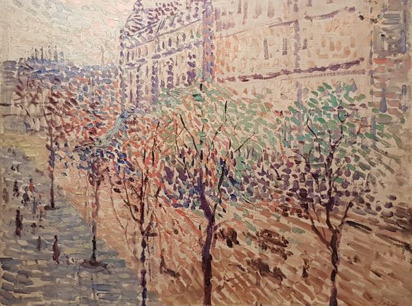 Curator: Here we have Van Gogh’s "View of Paris from Vincent's Room in the Rue Lepic," painted in 1887. It is currently housed at the Van Gogh Museum in Amsterdam. Editor: My immediate feeling is one of slight unease. There’s something about the close proximity to the buildings, the high vantage point, that creates a sense of being trapped, perhaps reflecting Van Gogh’s own internal state at the time. Curator: It's intriguing you say that. Considering Van Gogh’s stay in Paris was supposed to be a period of growth, influenced by Impressionism and Post-Impressionism, there is some melancholy present. The building facades feel imposing. I can’t help but see how he depicts the symbolic meaning behind domestic spaces. Editor: Absolutely. And what do you make of the obscured view? It's a cityscape, but not the triumphant cityscape we might expect. There’s a limited perspective, an obstructed horizon. It almost feels like a deliberate choice to convey social and emotional constriction. How much of it reflected social conditions around Parisian living? Curator: That reading resonates deeply. Think about the symbol of windows – they should offer possibility and connection with the outside world. But in this piece, they seem more like barriers, individual cells in a larger societal structure, trapping lives and aspirations, which leads to social critique. The impasto, thick paint, also accentuates the buildings’ solid and impassable nature. Editor: The way the buildings loom, with their geometric presence, against the swirling sky hints, maybe, to a city and its societal pressures beginning to overtake nature and rural settings. Curator: That’s a fascinating point. The turbulent sky almost feels like a premonition of his later, more expressive works, foreshadowing the emotional intensity to come, but also as an acknowledgment of what cities are made of: nature and culture coexisting in strange ways. It leaves me considering how our environment shapes us, and how we shape it. Editor: Indeed. Ultimately, "View of Paris" becomes a powerful statement about the complexities of urban existence and the individual’s place within it, as relevant today as it was then.