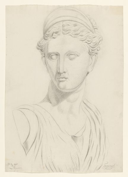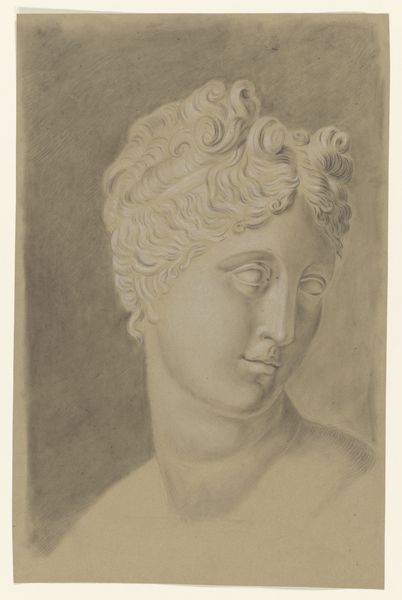 Curator: Johannes Tavenraat created this pencil drawing sometime between 1819 and 1881. It's called "Academiestudie naar een gips van een antiek beeld: bacchant," which translates to "Academic Study of a Plaster Cast of an Antique Statue: Bacchante." Editor: My first impression? It’s strikingly serene for a Bacchante. There’s such delicate modeling in the face, an almost melancholic repose, rendered so exquisitely in pencil on paper. The subtle tonal gradations, particularly around the eyes and mouth, capture the smoothness of the plaster it replicates. Curator: Precisely. It speaks to the artistic pedagogy of the 19th century. Artists honed their skills by meticulously copying classical sculptures like this one, idealizing ancient aesthetics but sanitizing the Dionysian revelry typically associated with Bacchantes, for instance. Editor: Sanitizing—that's a perfect descriptor! It highlights how even a study, purportedly objective, is mediated by the artist’s own sensibilities and the prevailing academic standards. Note how Tavenraat emphasizes the contrapposto of the face and that soft modeling...it creates an exquisite tension between movement and stasis. Curator: Right. There's a tension, too, between the perceived value of original artworks versus copies. Plaster casts made classical art more accessible, facilitating its widespread study and, therefore, influence across Europe's artistic academies. These casts democratized art education while upholding classical ideals. Editor: Democratization, yes, but also a kind of distancing. Removed from its original context and material, presented in monochrome, this Bacchante becomes a vehicle for technical display—an exercise in form and light. It is very impressive in its own way. Curator: And it reflects a period where art served civic functions, teaching good taste and propagating national identity. The popularity of such subjects served an art market eager to capitalize on cultural authority through history and classicism. Editor: A lovely, revealing object—one that speaks volumes about the confluence of classicism and academic discipline. The study’s technical refinement transcends its source. Curator: Yes, its careful lines help us explore shifting cultural values concerning art’s purpose during the 19th century. A seemingly simple drawing becomes rich in its many implications.