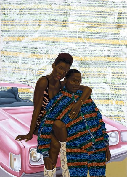 Curator: Here we have Monica Ikegwu's striking "Very Blue Two" created in 2017 using acrylic paint. What are your immediate impressions? Editor: It’s kind of melancholic, no? That cool blue palette, almost suffocating in its uniformity, coupled with those searching eyes. I wonder if it’s sadness, or perhaps quiet defiance radiating from the subject. Curator: The dominance of blue is certainly significant. Notice how Ikegwu uses varying shades and patterns – the decorative background almost flattens the pictorial space, pushing the figures forward and emphasizing their presence. There’s a tension created between the patterned surface and the three-dimensionality of the figures, drawing our eye to the formal elements at play here. Editor: Totally, the background feels like this ornate cage, or maybe a screen, with the two women placed deliberately in the front of it. I mean, their expressions are worlds apart too. One is turned away, seemingly detached, but the other is locked into your gaze and vulnerable and resilient all at once. It’s such an odd diptych. Curator: It is. Considering the artist’s engagement with neo-pop aesthetics, we might see the heart emblazoned on one figure's shirt, like a contemporary emblem, and explore questions surrounding commodification, identity, and representation of self. Editor: Interesting. It almost reads like a brand; a commentary on how we wear our hearts so plainly these days, exposed, branded, for better or worse. But those direct eyes from the other...are something beyond such surface-level interpretation, as well. Maybe Ikegwu's offering a deeper inquiry to viewers, one asking who are we *behind* those symbols. Curator: Indeed. The painting's strength is found in the push and pull it creates. The viewer's active participation in deconstructing Ikegwu’s carefully constructed composition is critical for meaning-making. Editor: I agree; you keep searching for answers and yet I suspect it wants to challenge and subvert anything too conclusive. In any case, it really makes one stop and stare. Curator: Very well put, yes, indeed a powerful painting on selfhood worth revisiting.