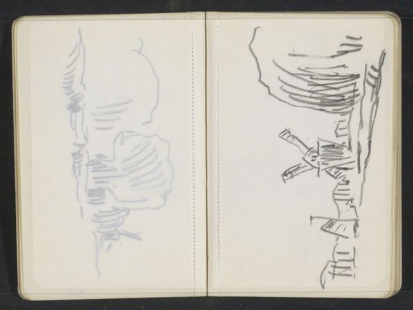 Editor: So, here we have Alexander Shilling’s "Bomen en een roeiboot aan een waterkant," or "Trees and a Rowing Boat at a Waterfront," done around the 1900s with pencil on paper. It looks like a sketchbook drawing, very spontaneous, almost ghostly. What strikes you about this particular sketch? Curator: You know, what grabs me first is the sheer immediacy. It’s a whisper of a scene, isn’t it? A memory barely caught before it dissolves. Look at how he’s rendered the trees—more like impressions of trees than meticulously drawn botanicals. It's like he's capturing not just what he sees, but how he *feels* seeing it. Almost melancholic, wouldn’t you say? Like a half-remembered dream. Editor: Yes, there's something very fleeting about it. The medium contributes to that effect. Pencil on paper feels so… transient. Is that sense of ephemerality a common theme in Shilling's work? Curator: I think so, in his sketches at least. He often seems drawn to capturing fleeting moments, that delicate dance between light and shadow, presence and absence. Notice how little detail he uses to convey the scene, yet you get such a clear sense of the space. Do you feel you're standing there? Editor: I do. There's a definite sense of place. It's interesting how a quick sketch can evoke so much. It almost makes me wonder what he felt sitting there by the water. Curator: Exactly! It invites speculation, fills in the gaps of what we *don't* see with our own imagination. Shilling leaves room for the viewer, for *you*, to become part of the experience. Editor: I like that. I definitely appreciate it more, understanding his process. Curator: Wonderful. Now imagine yourself grabbing *your* sketchbook... what vista would you whisper onto the page?