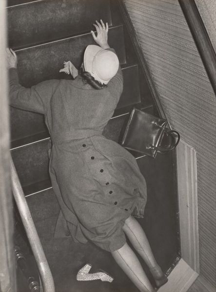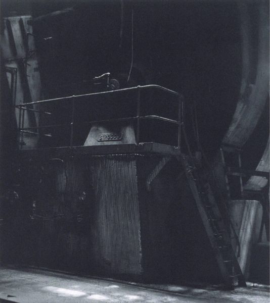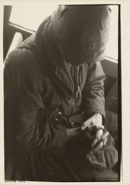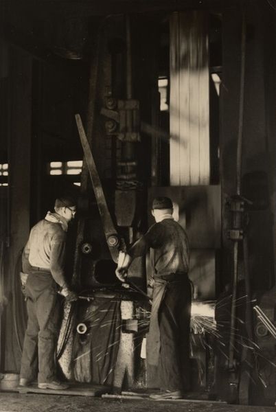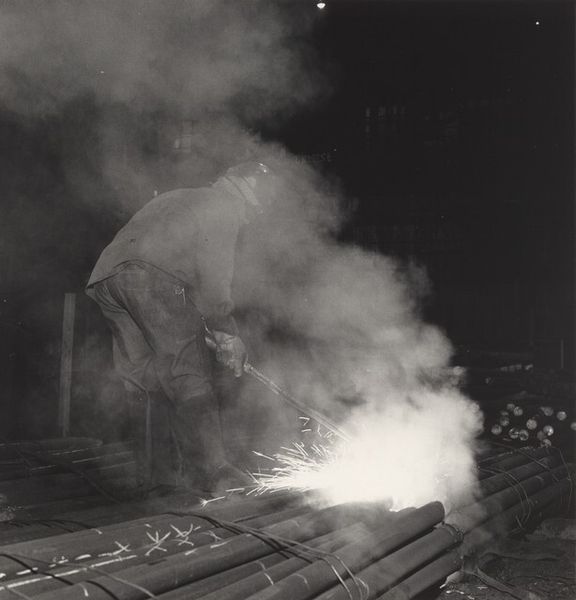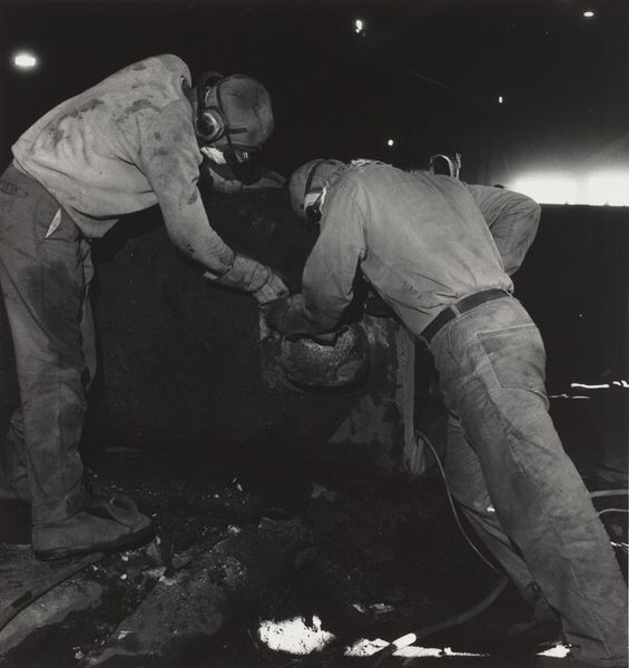 Editor: This is Milton Rogovin’s gelatin-silver print, “Atlas Steel Casting (Working People series)”, from 1978-1979. The monochromatic palette emphasizes the gritty industrial setting, and the worker’s figure almost seems to disappear into it. What visual elements stand out to you in this composition? Curator: The interplay of light and shadow is indeed compelling. Note the stark contrast: the blindingly bright molten metal versus the deep, cavernous blacks surrounding the figure. How does this contrast function? Editor: It really isolates the immediate action, almost abstracting the process of the steel casting. Everything else recedes, amplifying that central point of creation... or maybe production. Curator: Precisely. The figure, though central, is visually subsumed. Consider the geometric forms: the rectangular blocks, the linear tools, and even the dangling chain create a structured framework. The eye is led through a sequence of hard angles and tonal shifts. How do these geometric forms relate to the figure of the worker? Editor: I see… the rigidity mirrors, maybe even imprisons, the worker. His own form is obscured by the mask and protective clothing, further emphasizing the geometric over the organic. Curator: An astute observation. This focus diminishes the individual to a cog within the machine, a system rigorously defined by its forms and processes. Does it suggest an interpretation regarding the role of the worker in industry? Editor: Definitely! It is interesting to analyze the sharp forms. Now I see that by de-emphasizing the worker, Rogovin really calls our attention to how people are molded by the forms of production they find themselves inside. I didn't quite appreciate that at first glance. Curator: Exactly! The formalism is itself a statement, stripping away sentimentality to reveal the raw structure of industrial labor. Editor: Thank you, the close observation was helpful. Now I notice new layers within the art's form and appreciate its content much more.