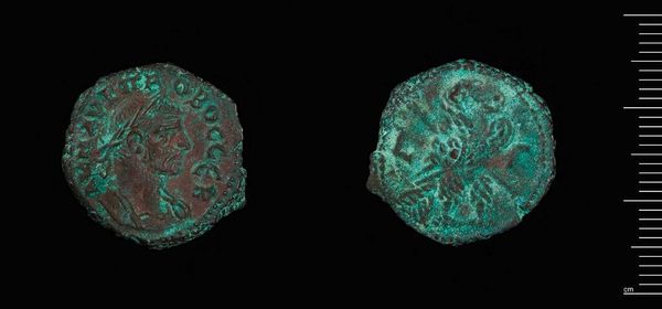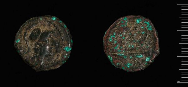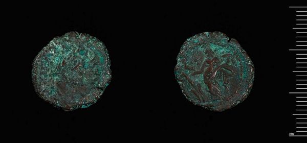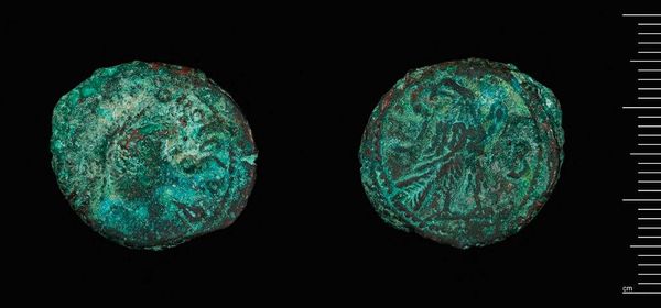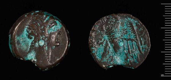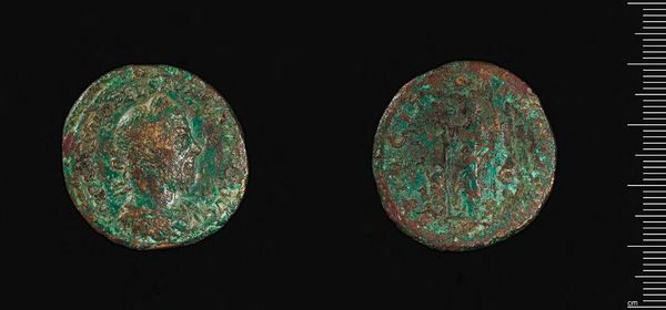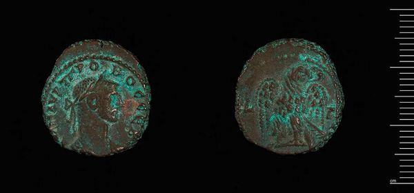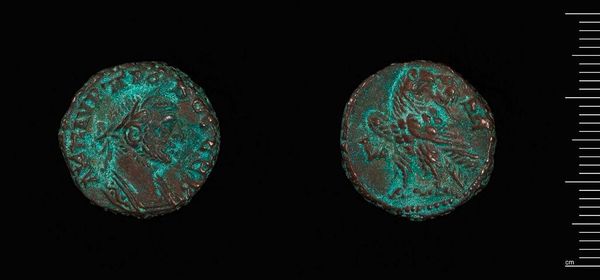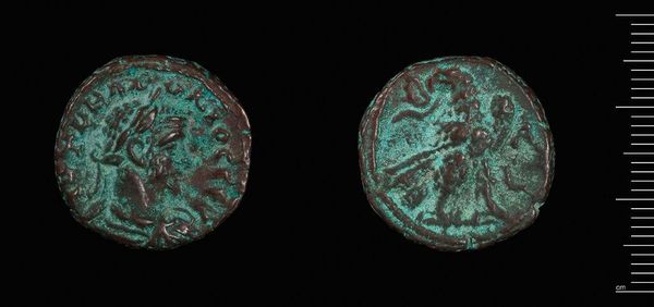 Curator: Here we have a Tetradrachm of Alexandria under Claudius II Gothicus. It resides here at the Harvard Art Museums and weighs 9.52 grams. Editor: The verdigris is striking—almost jewel-like against the faded bronze. It speaks of centuries buried, of slow chemical transformation. Curator: Indeed. Minted during a tumultuous period of Roman history, this coin served a vital purpose, disseminating the emperor's image and authority throughout the empire. Editor: It's remarkable how much information is packed into such a small object—the imperial portrait, the eagle symbolizing power... and all created through skilled metalworking. It served as more than just currency. Curator: Precisely. The coin was a carefully crafted piece of propaganda, reinforcing Claudius Gothicus's legitimacy during his brief but significant reign. Editor: The act of striking a coin, forcing metal to conform to an image, shows Roman control and their need to broadcast power and permanence through repetitive action. Curator: The coin gives us a window into the priorities and power structures of its time. Editor: And how those priorities played out in the material world, through labor, and resources.