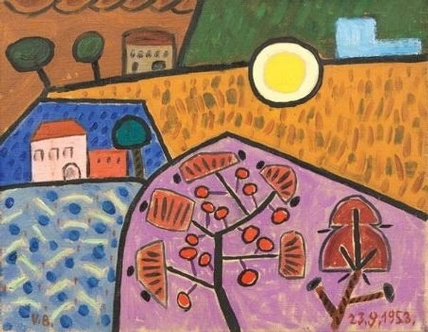 Jindrich Styrsky made this painting, Kostel Na Kopci, using oil on canvas. He uses a restrained palette here, mostly earth tones, but he varies his mark making to create a real sense of space. The paint is applied in thin washes, allowing Styrsky to build up layers of color and texture gradually. Look at the hill itself, he mixes the ochre with red in such a way that the road seems to be glowing. It invites you to walk along it. I think of Marsden Hartley's paintings of the church at Corea, Maine, when I look at this. Both artists had a way of investing their landscapes with a kind of spiritual yearning. It's like they're not just painting what they see, but what they feel, and that's something I always try to do in my own work too. The painting remains ambiguous, and maybe that’s the point.