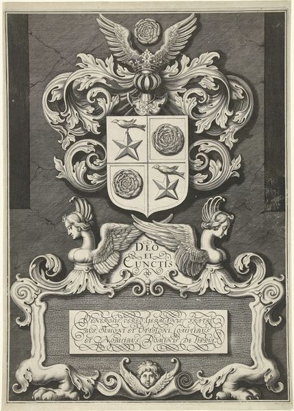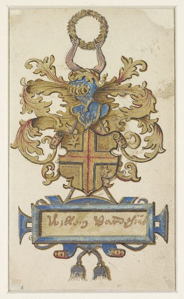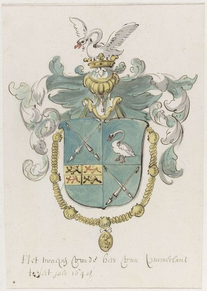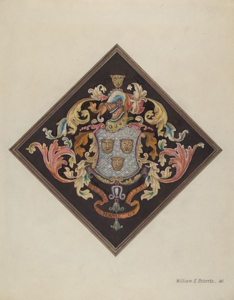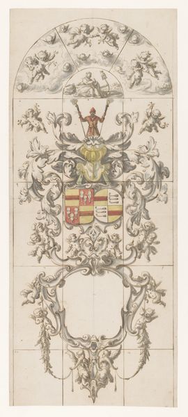 Editor: Here we have "Coat of Arms Surmounted by a Plumed Helmet," dating from around 1700 to 1800. It’s an anonymous work using watercolor and colored pencil, now at the Met. I find the composition rather busy, yet the faded colors create a strangely calming effect. What stands out to you? Curator: Immediately, I note the structured compartmentalization within the shield. Each quadrant presents a distinct visual element, a codified system designed to be read and understood according to the visual language of heraldry. The arrangement, the interplay of tinctures – the blues, golds, and blacks – and the disposition of charges warrant further semiotic exploration. Editor: Semiotic exploration? Could you elaborate on what you mean by "charges?" Curator: Observe how each symbol – the fleur-de-lis, the raven, the lion, the tower, the tree – these are charges. Each element signifies something beyond its mere representational form. The relationships of these symbols to one another within the composition provides a key for deciphering this particular lineage. Do you perceive a dominant visual element within these relationships? Editor: Perhaps the fleur-de-lis because it repeats? So the emphasis is on a French lineage or association with French nobility? Curator: Precisely. Its strategic placement invites an interpretation of primary association. Consider also the helmet; its presence signifies rank and status. This isn't mere decoration, but carefully arranged indicators of social standing. The artist, by focusing on such precision of the arrangement, and the inclusion of many varied symbols, communicates much. Editor: That makes sense. I see how the components relate to each other and convey meaning that isn't initially obvious, all in a visual form. Thanks! Curator: Indeed. Understanding how these elements combine permits a much richer understanding of this work's cultural and historical moment.