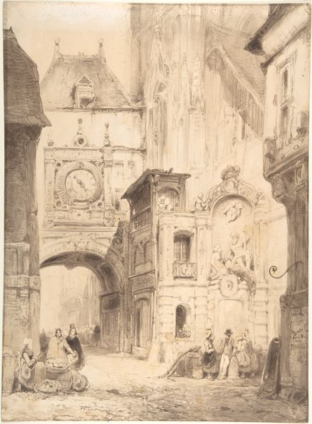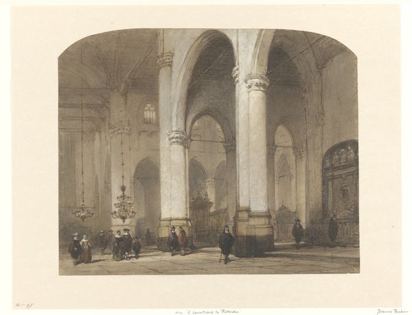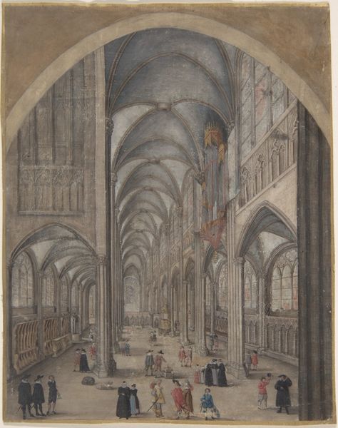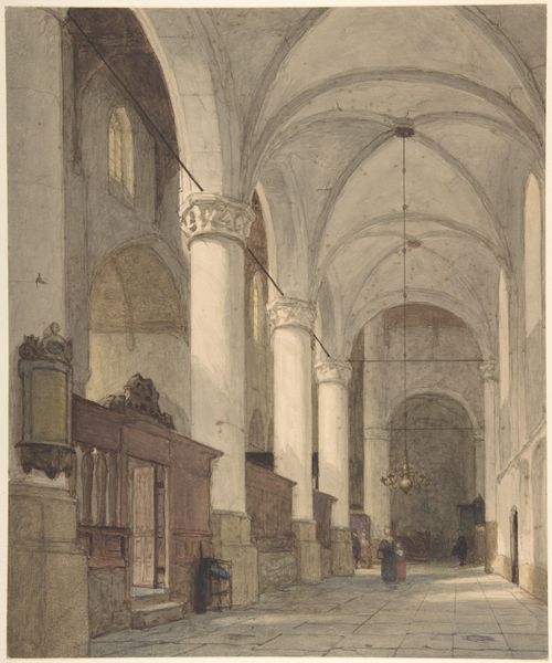 Editor: This is "Church Interior," created by Johannes Bosboom, date unknown. It's a drawing and print using gouache, watercolor, ink, and graphite on paper, currently residing here at the Art Institute of Chicago. I'm really struck by the light. How it illuminates the space and sort of guides my eye. What jumps out at you? Curator: The interplay of light definitely commands attention. Beyond that, I see a study in how institutions like the church shaped both social interaction and artistic expression. Bosboom wasn't just painting a space; he was depicting the *role* of that space. How does the composition guide people and encourage reflection? Editor: So you're saying the vastness, the high ceilings, the carefully placed figures... it’s all about power, the church asserting its presence? Curator: Precisely. The figures are deliberately small compared to the architecture, reinforcing the church's dominance. Also consider the date being unknown; This makes it even harder for the viewer to pinpoint the place to see if any type of artistic or political rebellion was brewing at this time and location. Editor: Interesting! I hadn't thought about the political dynamic. Does that realism style tie into this in any way? Curator: Absolutely. The academic realism grounds the spiritual power. It wasn't simply ethereal. It was materially, architecturally *real*. The art world was used to make certain ideas… well… come to life. What statement is the Church making with how real it portrays its setting? Editor: Hmm… It's interesting to see how much context affects how I perceive art, making it more profound. Curator: Exactly! Art and Institutions; it’s all related, and its fun to have your ideas and perceptions about Art be changed with information.