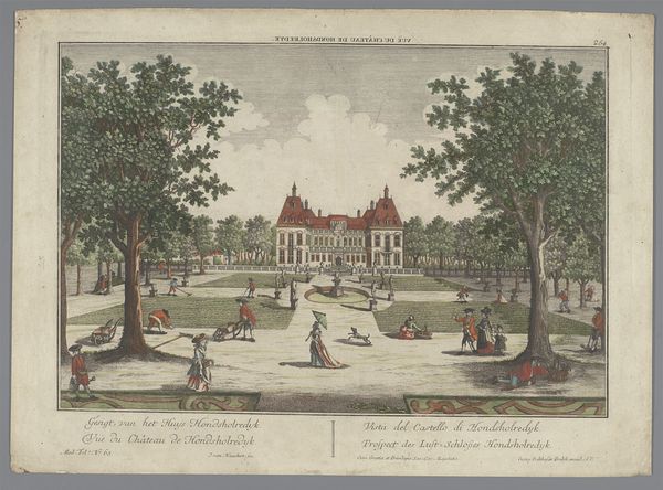 Editor: Here we have Bartholomaeus Roque’s "Jægersborg Slot," a print from 1746 currently housed in the SMK. It's an etching, a cityscape in the Baroque style. The figures strolling the manicured grounds give it such an air of leisurely sophistication. What's your take on this work? Curator: This print provides us a fascinating glimpse into the performance of power and leisure in 18th century Denmark. Jægersborg Slot wasn’t just a building, but a carefully constructed stage for the aristocracy. Editor: A stage? Curator: Absolutely! Consider the medium – a print. Prints like this were widely circulated, showcasing the grandeur of the Danish court and, by extension, the King’s authority. It's about projecting an image, isn't it? Who do you think this image was trying to reach? Editor: Maybe the merchant class, or even other royal families across Europe, to sort of say, "Look what we have!" Curator: Precisely! It reinforces social hierarchies. The carefully posed figures, their elaborate clothing, even the meticulously designed gardens—it's all calculated to convey wealth and control. The image normalizes aristocratic privilege by portraying it as harmonious and natural. Editor: That’s a perspective I hadn't considered. It's more than just a pretty picture. Curator: Indeed. Think about the role of institutions like the SMK in preserving and displaying such images. They become part of a narrative, perpetuating certain values and ideals about Danish history and national identity. Editor: So even today, the piece keeps working as social currency. Curator: Precisely. Reflecting on how art reinforces power and cultural norms is something everyone should consider. Editor: That’s an eye-opening view, examining not just the “what” but the “why” and the “how” behind it all.