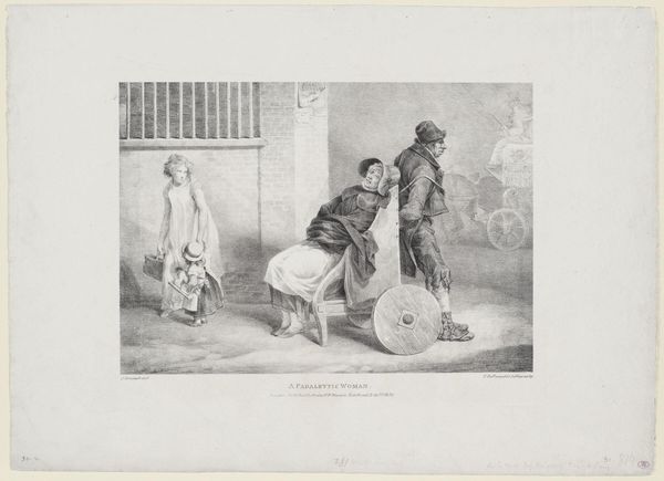 Editor: So, this is "Scenes from Russian Folk Life" by Ignatii Stepanovich Shchedrovskii. It's undated, but made with lithograph and drawing, printed on paper, and is currently held at the Art Institute of Chicago. The interaction between the figures seems really tense. What's your take on this scene? Curator: This lithograph captures a fascinating social dynamic. We see a clear visual contrast: a uniformed official engaging with a figure from a lower social stratum, perhaps a street cleaner or common laborer, with children looking on. How do you think images like this functioned within 19th-century Russian society? Editor: I guess they provided commentary, maybe social criticism? The way the artist uses light to highlight the figures also suggests some intention to expose the socio-economic power differences. Curator: Precisely. Lithography, as a relatively accessible medium, allowed for wider distribution of such social observations. Consider the institutional context: art academies were becoming more focused on Realism, depicting everyday life. Did art become a mirror reflecting society, revealing some fault lines in the dominant ideology? Editor: Definitely. It feels like the artist wants us to think about these class distinctions, making it visible through art in public institutions, influencing societal discourse. I am wondering about the influence of political forces on this type of imagery? Curator: The Tsarist regime had very definite views on imagery, which at times prompted self-censorship from artist, and occasionally even led to works being suppressed, at least from the perspective of exhibitions accessible to a wider audience. But on the other hand, these scenes helped create an idea of Russian-ness. Editor: I hadn't considered that tension – reflecting reality while constructing a national identity. Curator: Yes, this tension is present in the image. Thinking about it, what did you glean about art and its public function? Editor: That images like this reveal how artists use art as a social mirror, highlighting existing fault lines in their society. Curator: And at the same time, images such as this one, helped to define the national sentiment of Russia, creating and maintaining common traits through shared representations.