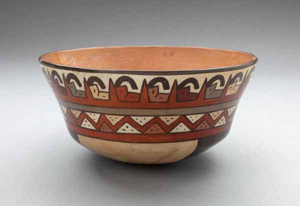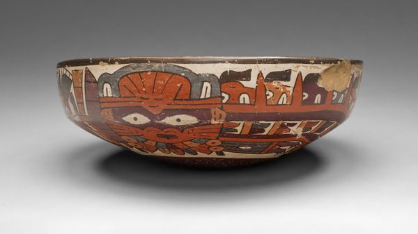 Editor: Here we have a Nazca flaring bowl, dating from around 180 to 500 AD, currently held at the Art Institute of Chicago. The abstract killer whale design really pops against the terracotta, with such rhythmic, bold lines. How do you interpret this piece, focusing on the use of such potent symbolism? Curator: This ceramic bowl provides insight into the Nazca people's worldview, their deep connection with the natural world, and the symbolic weight they gave to animals. Note the killer whale motif--it isn’t simply decorative. Its stylized form, combining both geometric and figurative elements, suggests ritualistic significance. Perhaps the killer whale symbolizes power, control of the seas, or a link to the supernatural realm? What emotional reaction do you have to the imagery, absent specific cultural context? Editor: It evokes a feeling of respect and awe, definitely conveying strength. The repetitive pattern and the piercing eye give it an almost hypnotic quality. How does the killer whale's depiction contribute to this feeling? Curator: Consider that marine life often features prominently in Nazca art. This choice reflects their dependence on, and perhaps their veneration of, the ocean. The abstraction allows for layered meanings – this stylized "killer whale" transcends the animal itself, and speaks to broader themes of life, death, and rebirth. These were probably significant aspects of Nazca culture. Do you see a link between this form of symbolic representation and contemporary practices? Editor: Now that you mention it, I see similarities to contemporary indigenous art expressing cultural identity and storytelling. It makes you wonder about the continuities in human expression. Curator: Exactly! These symbols have enduring relevance, representing how human communities interpret, convey and sustain values over generations through image and object.