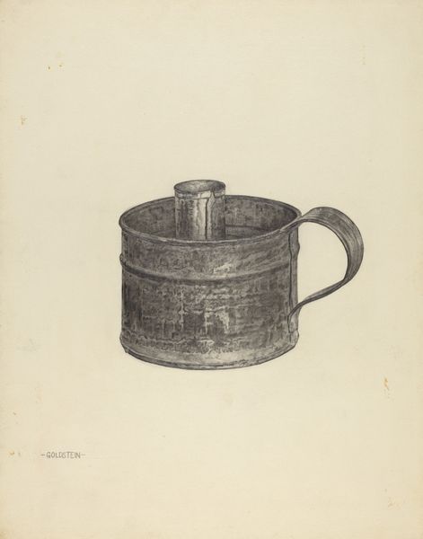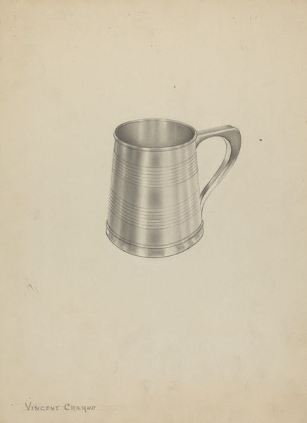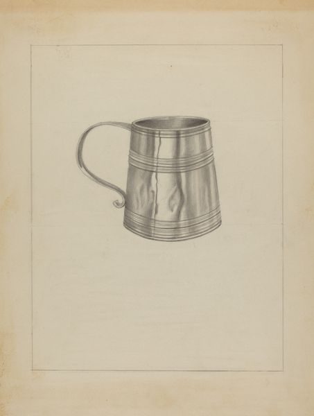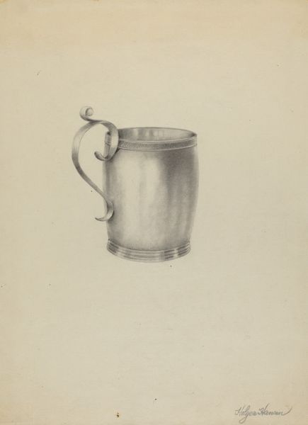 Curator: Palmyra Pimentel rendered this intriguing still life, "Silver Mug," sometime between 1935 and 1942, using only a humble pencil. Editor: It’s a beautifully rendered, volumetric object emerging out of what seems like limitless negative space. The tonality is incredible. Curator: Indeed, such careful draftsmanship seems fitting, since the mug shape is almost archetypal, something used by ordinary people, echoing across generations, connecting us through shared daily rituals. Editor: Absolutely. I'm struck by how Pimentel utilizes line weight and shading to evoke the texture and reflective qualities of the metal, yet with only a few minimal marks, such as near the lip of the mug and near the base. Curator: It's as if the mug holds memories – the cold beverage during a summer, perhaps. Notice the etched mark, a circle near the handle--a possible allusion to heraldry? To ancestry? It invites speculation. Editor: I find its beauty comes through Pimentel’s exacting attention to the depiction of volume, even when using such basic and traditional means to do it. In a way, that dedication adds an intensity to the piece that gives it such presence, or gravity. Curator: It's fascinating how a seemingly simple object, through close observation and skillful rendering, can become a vessel not just for liquid, but for deeper human connections and meaning. Editor: I agree, it’s more than just an object portrayed; it’s a powerful visual study of how light interacts with form. Curator: An intimate glimpse into an object used perhaps many times. Editor: An image worth another view.