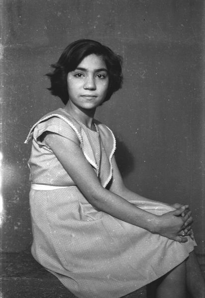 Editor: This photograph, taken by Hashem el Madani between 1948 and 1953, shows Ahmad el Abed’s sister in Lebanon. The pose feels both staged and very natural. What symbols do you see at play here? Curator: I see a fascinating layering of identity. The studio portrait, standardized yet intimate, reveals cultural memory through its very format. The woman’s gaze, direct yet soft, carries untold stories. Editor: What do you mean by cultural memory? Curator: Consider how studio portraits like this were often used to solidify identity, both for personal remembrance and for wider circulation within the community. The head covering or bandage becomes an emblem, a silent narrative of healing or protection. Editor: That's insightful. I hadn't considered the layering of meaning within the seemingly simple act of portraiture. Curator: Exactly. The image transcends being just a picture; it's a vessel holding cultural and personal significance, asking us to look beyond the surface.