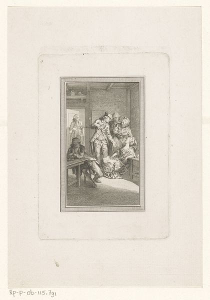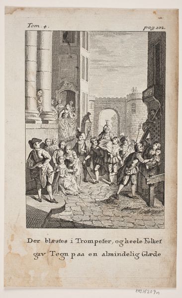 Curator: Here we have "Groene ezel", or "Green Donkey", a late 18th-century engraving by Noach van der Meer the Younger, now residing here at the Rijksmuseum. It seems to depict a fairly lively street scene. Editor: Oh, look, my first impression is that it feels staged somehow, like a scene from a play! The donkey’s got a garland, like he is a prize, and everyone's a bit overdressed for an ordinary day. The monochrome, though, gives it an interesting melancholic touch. Curator: Precisely. Van der Meer positions this print firmly within the tradition of Dutch genre painting, echoing artists like Steen, and situates it within a broader framework of social commentary. Notice how he captures the intricate social dynamics within the community, especially how the children are playfully interacting with the donkey. Editor: Playful indeed! It reminds me a little of a satirical wink. A little dig, maybe at folks’ fascination with something… well, somewhat silly? Makes me wonder if "Green Donkey" is slang for something other than a green donkey. Curator: It may well be! Color, particularly in relation to animals, carried potent symbolic weight during this era. The 'green' donkey becomes an intriguing lens to examine 18th-century class, politics, and satirical sensibilities. Editor: Right, and there's that contrast, isn’t there, between the careful detailing and the playful subject, with almost everyone facing us. Did he want us, the viewers, to participate in this little theatrical? Because it really feels like we’re watching it all unfold! Curator: Absolutely. Van der Meer, through his mastery of line and composition, prompts the viewer to consider what is natural, and what's constructed in both art and life itself. I wonder, could this scene be mirroring, through this animal, the construction of identity within Dutch society at that time? Editor: Oh, you know, maybe! It does make you question the everyday theatre we’re all performing, doesn’t it? Sort of like us talking about donkeys in a museum – the absurd and insightful meeting! Curator: Well, reflecting on this print, it encourages me to look beneath the surface of seemingly ordinary moments to uncover deeper societal meanings. Editor: And me? Well, I am off to find more funny donkeys. It’s always about the silly stuff, isn’t it? Thanks, Mr. Van der Meer!