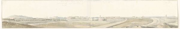 Curator: Let's turn our attention to Louis Ducros' "Gezicht op Alcamo," painted in 1778 and held here at the Rijksmuseum. Ducros was working en plein air, capturing this scene with watercolor. Editor: My first impression is how muted the colors are, almost a sepia tone. It evokes a sense of looking at a memory, something distant and perhaps idealized. Curator: Precisely! Consider that 18th-century viewers were highly literate in symbolic landscapes. The panoramic vista was often deployed to signify progress and enlightenment ideals. Alcamo, perched as it is, suggests dominion, the small cluster of buildings sitting harmoniously within the natural landscape. Editor: I am very interested in that harmony you mention. Watercolors were frequently chosen for landscapes and travel sketches—portability mattered. What brushes were used? What paper supports could he source readily during his travels? The fact he worked on this panorama on-site speaks volumes about his methods and how art was created at the time. Curator: That commitment to capturing the essence of a specific place through observation fits perfectly within the Romantic tradition that was emerging. Note how the distant mountains are rendered, fading into the mist, suggesting a certain sublime grandeur. The scene is about more than the buildings—it is equally focused on conveying a specific mood. Editor: Though, let's not over-idealize "en plein air," I'd bet this work went through various material states: sketches, layering, and refinement back in a studio! The very thin pigment, spread evenly, may have required considerable processing or maybe this very wide paper was not so absorbent and required extra treatment. There were undoubtedly constraints within these practices. Curator: Fair enough, material processes shaped what Ducros was trying to achieve with a clear symbolism of the location. In a sense, the town becomes almost emblematic in his rendering. It represents not just Alcamo, but perhaps a certain type of aspiration for harmonious progress during the age of enlightenment. Editor: Indeed. Thinking about how landscape artists like Ducros handled these practical concerns and the very materials employed sheds light on the realities of how landscapes came to embody that spirit of the age. The physical stuff and the process, shaped by culture, shaped its vision.