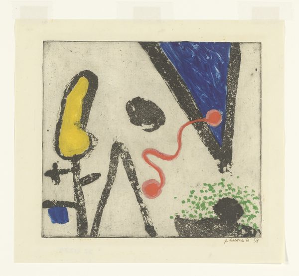 Curator: This is "Le Bagnard et sa compagne" by Joan Miró, created using acrylic paint. It’s one of those pieces that looks utterly simple but, well, is it? Editor: My first thought? It’s like a cosmic cartoon, both playful and unsettling. The strong black lines against the bold colours, feels almost aggressive. Curator: Aggressive, yes! I can see that. Maybe not "aggressive," but the forms certainly aren't saccharine, are they? Miro’s lines often feel like a child’s drawing but loaded with hidden symbols. Given his engagement with Surrealism, one must ask: What’s lurking beneath the surface? Editor: Absolutely. Think of the period Miró was working in. Post-war Europe was grappling with societal upheaval and existential anxieties. Could these seemingly childlike forms be a way of confronting and subverting those darker realities? The bagnard, or convict, is a loaded figure, suggesting marginalisation, criminality, perhaps even political dissidence. Curator: Oh, interesting point. I think it’s impossible to uncouple Miro from Catalonia and his outspoken contempt for Franco’s dictatorship, he turned his art into a coded resistance. "Le Bagnard" and companion become more than just shapes. The title hints at companionship and solidarity, maybe among the oppressed? Editor: I like how you’re framing that. It definitely moves beyond formal analysis. Even the geometric abstraction—those vibrant red, blue and black blocks—refuses to settle. Nothing is quite resolved, reflecting a world in flux, grappling with profound contradictions. Curator: You know, I can get utterly lost in these contradictions; the dance between seeming randomness and the powerful intent. It almost feels as though I’m peering into his mind's landscape. Editor: And that’s where art finds its power, right? It's that intersection of personal vision and wider social narratives. The visual shorthand here allows us to consider difficult subjects and histories—ones that perhaps challenge the dominant stories. Curator: Absolutely. Every blot and line feels considered. Editor: Ultimately, this piece leaves us more unsettled than when we began, I think, prompting us to confront difficult questions and find our own connections between form and feeling, abstraction and reality. Curator: Which is really quite a feat for such seemingly straightforward piece! Miró still holds up as an agitator—pushing, probing and ultimately questioning everything.