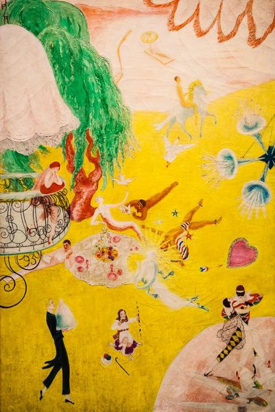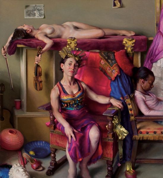 Andrey Remnev created "Rags" using oil on canvas with layering and glazing techniques reminiscent of classical painting. The composition is strikingly constructed with patterns, figures and a foreground of greyhounds, creating a tapestry-like surface where representational elements seem woven together. The painting presents a series of women holding up different textiles or cloths, each displaying unique scenes. This play with layers and frames within the painting invites us to consider the nature of representation itself. Remnev challenges the traditional concept of a painting as a window onto the world, instead emphasizing its character as a constructed surface. The textile patterns worn by the women, along with the scenes depicted on the cloths they hold, destabilize any singular reading. Ultimately, Remnev's attention to detail and his careful arrangement of forms create a self-referential quality that prompts us to reflect on the constructed nature of art and meaning.