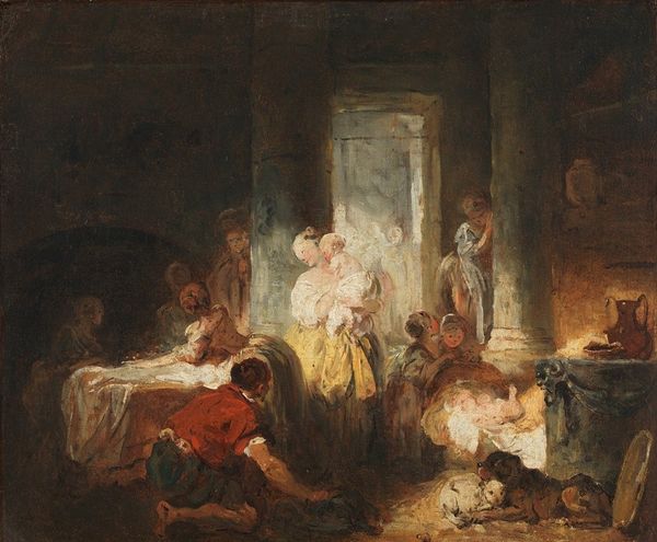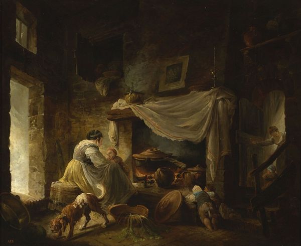 Curator: There's a striking stillness in this image, isn't there? I am instantly drawn to how intimate the domestic setting feels. Editor: It is indeed quiet. "At Rest, Algeria," a painting believed to be the work of Frederick Arthur Bridgman. The scene is cast in earth tones illuminated by flickering firelight; women in traditional garb gather, creating an intimate communal scene. Curator: Notice how the flames animate their faces, creating shadows that lend an almost mythical quality to their postures and veils. There's a timeless quality to this domestic scene, something universally recognizable about companionship and the hearth. Editor: Yes, and this is achieved through a carefully staged Orientalist lens. This genre presented the "Orient" as timeless, unchanging, a space onto which Western fantasies were projected. The painting freezes Algeria at rest as if resisting modernity. Curator: The symbol of 'rest' is fascinating; do you read it as a symbol of inertia or potential? The quiet moments captured—they speak volumes of private histories and internal worlds, no? The quietude in that circle resonates powerfully even now. Editor: Potentially both, right? Bridgman creates a harmonious vision, yes, yet he exoticizes and simplifies these Algerian women. It romanticizes colonial power relations, reinforcing Europe’s dominance by emphasizing cultural difference. I wonder if what looks serene isn’t, in fact, imposed silence? Curator: It is undeniable; Bridgman approaches this 'at rest' moment through the lens of the late nineteenth century, with Europe grappling with colonial ambitions and a desire for exoticized tranquility. The symbolism may inadvertently reveal more about the observer than the observed. Editor: Ultimately, the composition offers us layers. Bridgman, celebrated for his Orientalist subjects, delivers a complex visual artifact inviting interrogation. The brushstrokes hide, yet also reveal—histories and political stances embedded within those shadowy figures. Curator: What appears serene is indeed laced with histories—an important takeaway. Editor: Indeed, images are seldom neutral; they often beckon a much richer conversation beyond aesthetics.