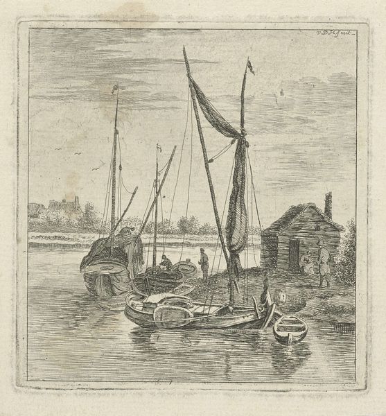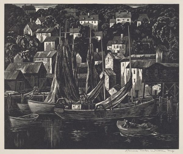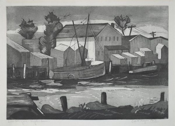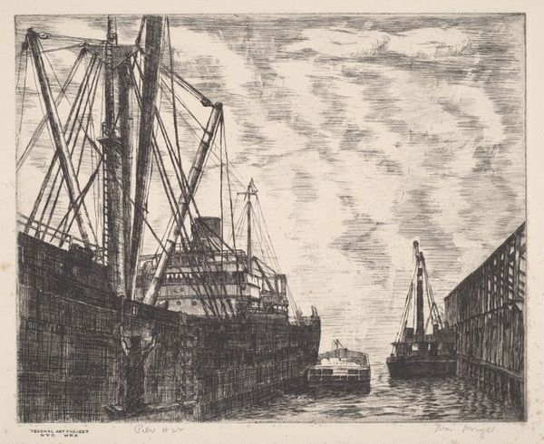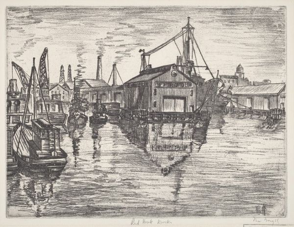 Curator: Well, look at this, an industrial lullaby almost. Margaret Hunt Lansing created this pencil drawing, Drydock, around 1939. Editor: Lullaby, huh? To me it screams, “Here there be toil!” Everything looks a bit slumped and gritty, the whole scene feels weighed down, almost… melancholic. Curator: I get that. It's a scene steeped in work. A boat is docked, maybe for repair. We see the architectural structures that dominate cityscapes– cranes, warehouses, factories– framed against a dramatic, almost operatic sky. What strikes me is how Lansing manages to imbue it with such sensitivity. Editor: It’s her touch, the hand of the artist present in the hatching, the textures… It makes it less about cold industry, and more about the human story _within_ the machines. It’s romantic somehow, even though it’s just a dry dock. Curator: Exactly! Consider when this was made – the late 30s, still feeling the reverberations of the Great Depression. Artists were very focused on representing American scenes and realities. Lansing's piece speaks to this trend of depicting the everyday life of workers. The industrial scene is elevated by her technique. It reminds us that these spaces held stories, hopes, and struggles. It’s a social history recorded with a soft pencil. Editor: It's interesting. Looking closely, she hasn’t romanticized it entirely. It’s honest, wouldn't you agree? There's no false optimism plastered on the buildings. More of a quiet dignity, a respect for the reality. Curator: I completely agree. I wonder about her choice of the pencil medium, too. Prints allowed these images to circulate widely and be seen by a broad audience. It democratized the image. Editor: It does have a lovely weight to it, despite being a “simple” pencil drawing. Looking at the steam billowing out of the tugboat… feels weighty, powerful. And look how it mimics the clouds… Curator: Beautiful observation. So, as a final thought, how has viewing the artwork changed how you now see its role? Editor: For me, seeing the drawing today reminds us of the necessity to examine these histories, how easily voices are muted. It invites introspection regarding how economic and social transformations shape identities, cities, lives. Curator: It serves as a tender yet resolute witness to working lives—of what continues to persist and also fade. Thank you.