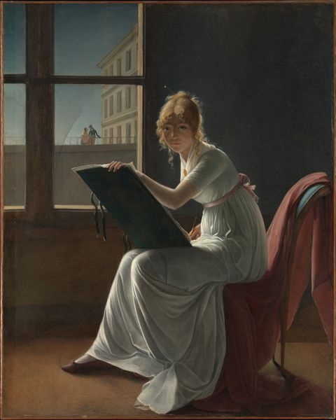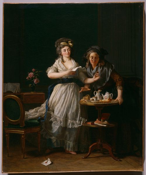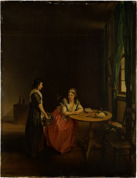 Editor: Here we have "Dutch Girl at Breakfast," an oil painting from around 1756 by Jean-Étienne Liotard. There’s such an intimate feel to this genre painting of a young woman. The composition and subdued lighting add a layer of tranquility, as though we’re catching her in a very private moment. What stands out to you? Curator: It’s interesting to consider this in the context of 18th-century European society. These genre scenes were popular amongst the emerging middle class. The detail afforded to the interior—the clothing and domestic setting—suggest a certain level of affluence. This image functions, in a way, as aspirational; a way to display domestic virtue and bourgeois respectability. Editor: I see what you mean about respectability. Her simple dress and actions could signify modesty. Would you say the painting enforces certain expectations for women of the time? Curator: Absolutely. Paintings like these reinforced social norms, offering moral instruction through visual representation. This quiet, domestic scene implies an ideal for feminine behavior. What do you make of her averted gaze and her position near the center of the picture? Editor: Her gaze does add a sense of mystery and introspective feeling to it. It invites contemplation from us. Considering that portraits often represented wealthy elites and rulers, it makes me wonder about the public perception of everyday life then. How novel was it? Curator: Good question! The popularity of genre paintings signalled a shift towards appreciating, or perhaps idealising, the everyday lives of ordinary people. They played a significant role in shaping public opinion and influencing social behaviors. The Dutch Girl epitomises the burgeoning importance of private life during the rise of bourgeois culture. Editor: That's so interesting! Now I view it less as just a peaceful picture and more as an insight into 18th-century values. Curator: Indeed, art often holds a mirror to society, reflecting our aspirations, expectations, and even our subtle biases.