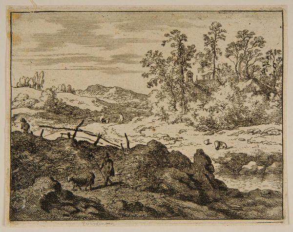 Editor: This is "Shepherd" by Allart van Everdingen, held at the Harvard Art Museums. It's an etching, and I’m struck by the way the landscape seems almost manufactured through the density of lines. What do you see in this piece? Curator: I see the labor embedded in the printmaking process itself. The lines, seemingly spontaneous, are actually the result of careful, deliberate actions – the biting of acid into the metal plate, the physical act of printing. Editor: So, you’re saying the material process is integral to understanding the image? Curator: Exactly. The subject matter – a shepherd, a pastoral scene – is romanticized, but the etching process brings a layer of industrial production to it. It makes us consider the consumption and dissemination of images in Everdingen's time. Editor: That’s a totally different way of seeing it. I never considered the labor behind the image itself. Curator: Considering the means of production allows us to challenge the divide between the artistic representation and the reality of its making.