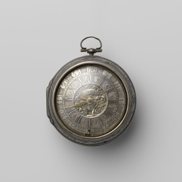 Curator: Immediately I notice a quiet dignity about it. Editor: Indeed. What we're looking at is a pocket watch, created around 1697 by John Mitzell. It's part of the decorative arts collection at the Metropolitan Museum. It's crafted primarily from metal. Curator: The baroque style certainly exudes that sense of importance. But for me, there is something about the color contrast of the dark surround against the gleaming silver face, like the contrast of mortality and fleeting time. It is heavy with implications. Editor: Yes, I see how you'd arrive there. But consider the circular form. It invites us to think of wholeness, unity. Note how the watch face is engraved, segmented with those elegant Roman numerals. Curator: Those Roman numerals evoke a link to a past steeped in tradition, don’t they? Time stretching back through history, demanding reflection. This tiny sculpture invites contemplation of not only linear time but also how time moves for each of us. Editor: Quite so, and the winding key becomes almost architectural with its T shape and heavy gauge metal, a small monument of engineering and design that accentuates the intricate clockwork within. Consider the play of light and shadow on the dial as well, a careful study of textures. Curator: All objects exist in cultural and social landscapes. I wonder, who owned it? What pivotal moments did its ticking accompany? An object such as this resonates beyond mere mechanics, acting as a silent witness. Editor: I can appreciate the pull to consider such possibilities, especially as the artifact, in isolation, presents its materials in the purest, most abstracted fashion. In so doing, the artist speaks with a simple grandeur. Curator: Its baroque design provides insight into the symbolic worldview of its time. Each scroll, each flourish carries echoes of the beliefs and aspirations held by its creators and users. A profound object. Editor: Absolutely. Mitzell's craft gives rise to philosophical ideas; ideas that linger even centuries later.