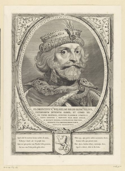 Curator: We're looking at "Portret van Dirk I, graaf van Holland," an engraving from 1650 by Cornelis Visscher, currently residing in the Rijksmuseum. Editor: Immediately, I get this somber, almost severe vibe from the figure, but he's decked out like a sultan! I suppose the clothing and ornamental border is there to present an official presentation of status, although there is almost something pained and reluctant about him. Curator: Visscher's employment of baroque conventions serves to monumentalize Dirk I. Consider the density of line work that models form, how it defines the textures of the turban and armour, contrasted against the smooth planes of his face. Notice also how Latin inscriptions below the figure lend historical weight to his identity. Editor: The details are great! The engraving makes that armour pop like it's catching the light. The ornate border and meticulous lettering give him a real sense of place in history. But, you know, seeing him through Visscher's eyes—a 17th-century lens— makes me wonder how much of this image is accurate and how much is propaganda. Did Dirk really rock that turban? Was he as stern as he appears? Curator: The image adheres to portraiture conventions of the period, certainly, while the use of symbolic elements underscores Dirk I's authority. The textures of his clothing create an interplay between flatness and depth. Through line variation and hatching, the engraver brings dimensionality to what is fundamentally a two-dimensional medium. Editor: True, the artistry is impressive, and it’s fascinating to see history shaped by an artist’s hand. What lasts with me, however, is the guy's face itself. Despite the formality, you glimpse some individual. He seems like he’s carrying a burden—literally carrying the weight of history on his shoulders. Curator: A keen observation; and ultimately, this tension between the man and his symbolic representation makes this historical piece especially captivating, doesn't it? Editor: Indeed, an interesting intersection. The work reminds us of both the power and the pitfalls inherent in creating lasting images.