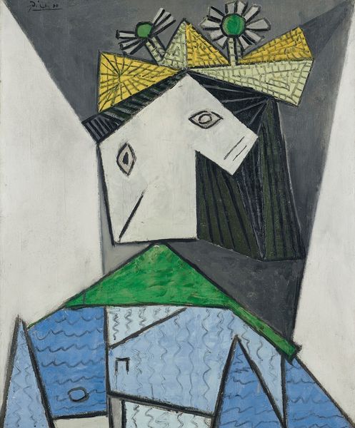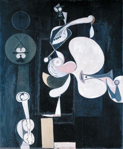 Curator: Looking at Picasso's "Crustacé et bouteille," painted in 1948, a fascinating still life rendered in oil, what immediately strikes you about its form and execution? Editor: It's definitely a vibrant piece, almost jarring, despite depicting everyday objects. The heavy impasto, particularly in the background, really makes me think about the physicality of the paint itself. What do you see in this painting beyond the obvious subject matter? Curator: The application of paint itself speaks volumes. Notice how the brushstrokes are visible, almost aggressively so. The materiality directs our gaze towards the act of creation itself. It challenges the traditional boundaries between representation and the concrete reality of materials. Considering the era, how do you think the post-war scarcity might have influenced Picasso's emphasis on base materials? Editor: That's interesting. Maybe the crudeness points to available supplies or a rejection of pre-war elegance in art. Does the rendering reflect more than mere materials; can it mirror society's relationship with labor during reconstruction? Curator: Absolutely! Think about the artist's labour and the availability and costs of different colours: there’s an argument to be made for interpreting Picasso's abstraction as a reaction to mass production by showcasing his own hands. How does his style also elevate functional painting and construction practices to ‘high art’? Editor: So the piece embodies the transition and accessibility. Its message might not just be about war themes, but a revolution in seeing common tools and processes. Curator: Exactly. Seeing the potential social meanings from the art process itself is what interests me here. Editor: I see what you mean! Looking at it again, focusing on the material handling, it becomes more about artistic agency. Thanks. Curator: My pleasure! I look forward to continuing this discussion with more artwork, should time allow!